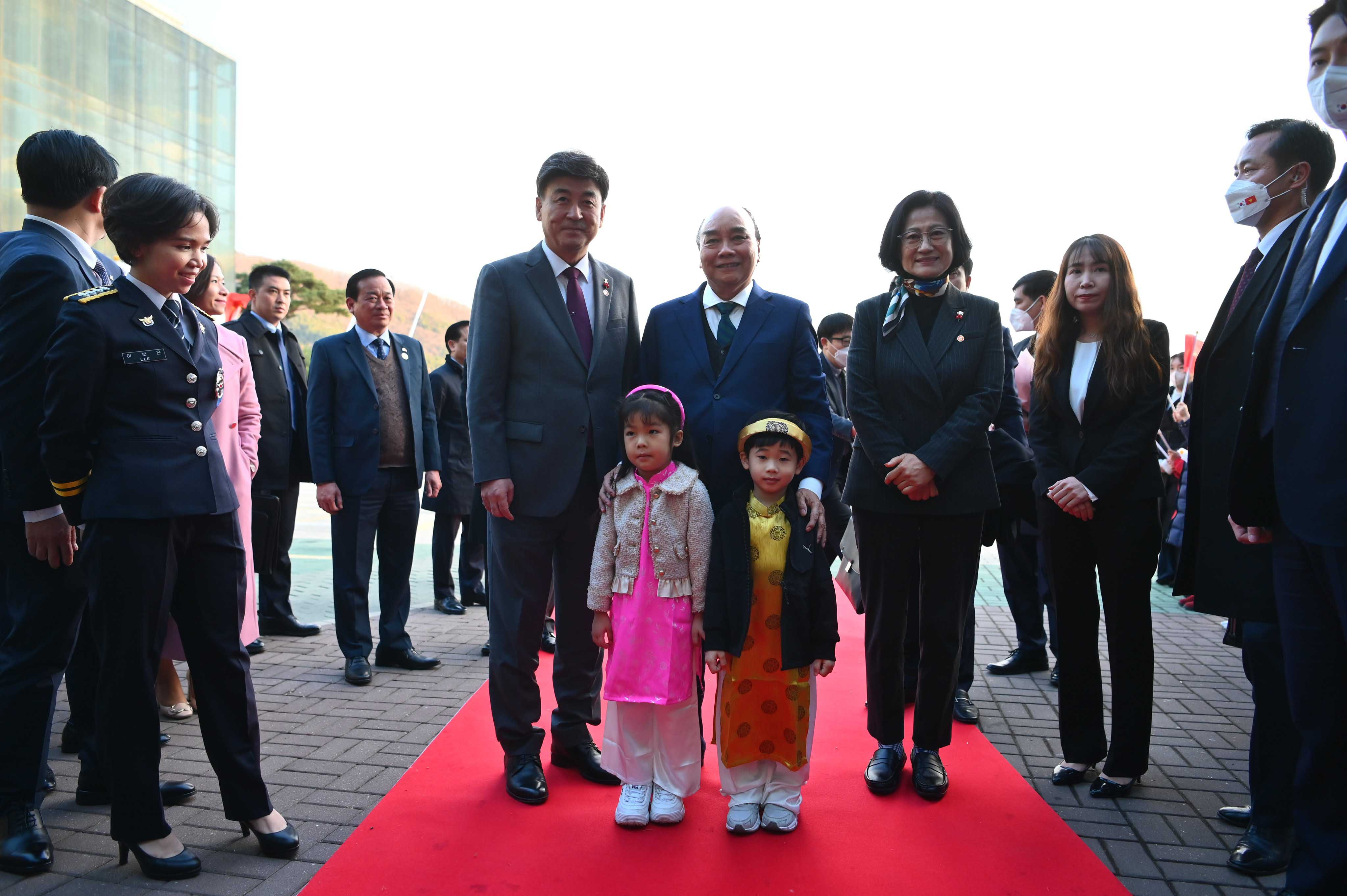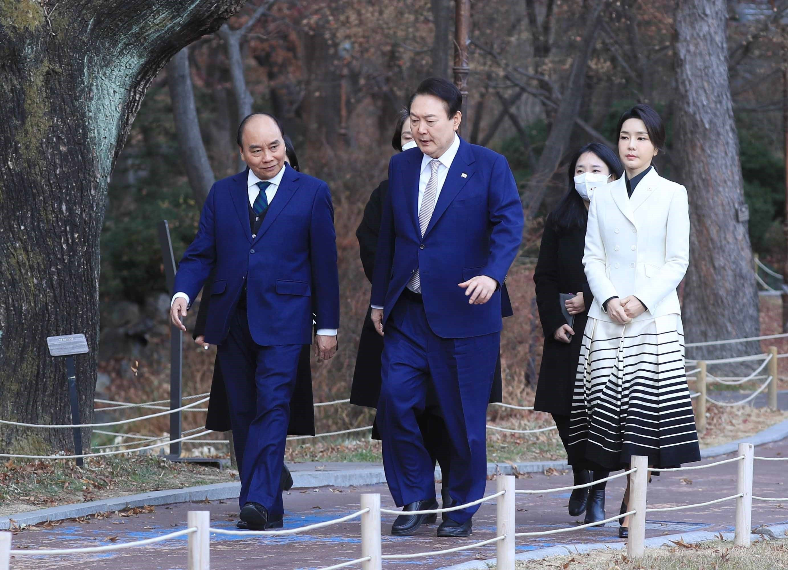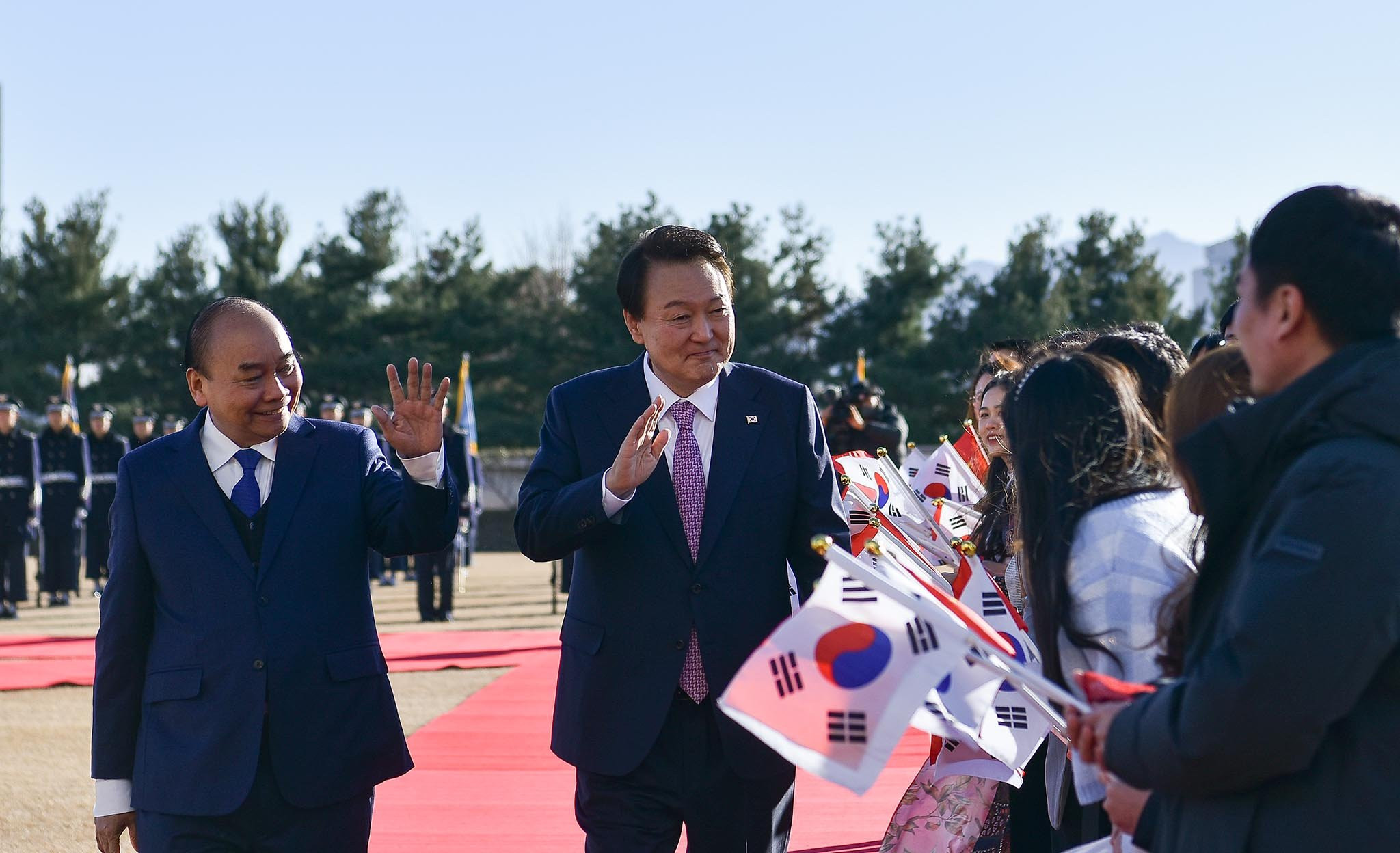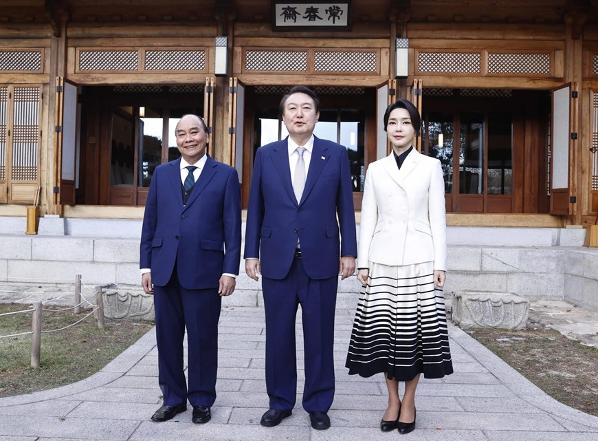 Tại trụ sở Văn phòng Tổng thống, lễ đón chính thức Chủ tịch nước Nguyễn Xuân Phúc cùng đoàn cấp cao Việt Nam đã diễn ra rất trang trọng với nhiều loạt đại bác rền vang chào mừng tại thủ đô Seoul theo nghi thức cao nhất của Hàn Quốc dưới sự chủ trì của Tổng thống Yoon Suk Yeol.