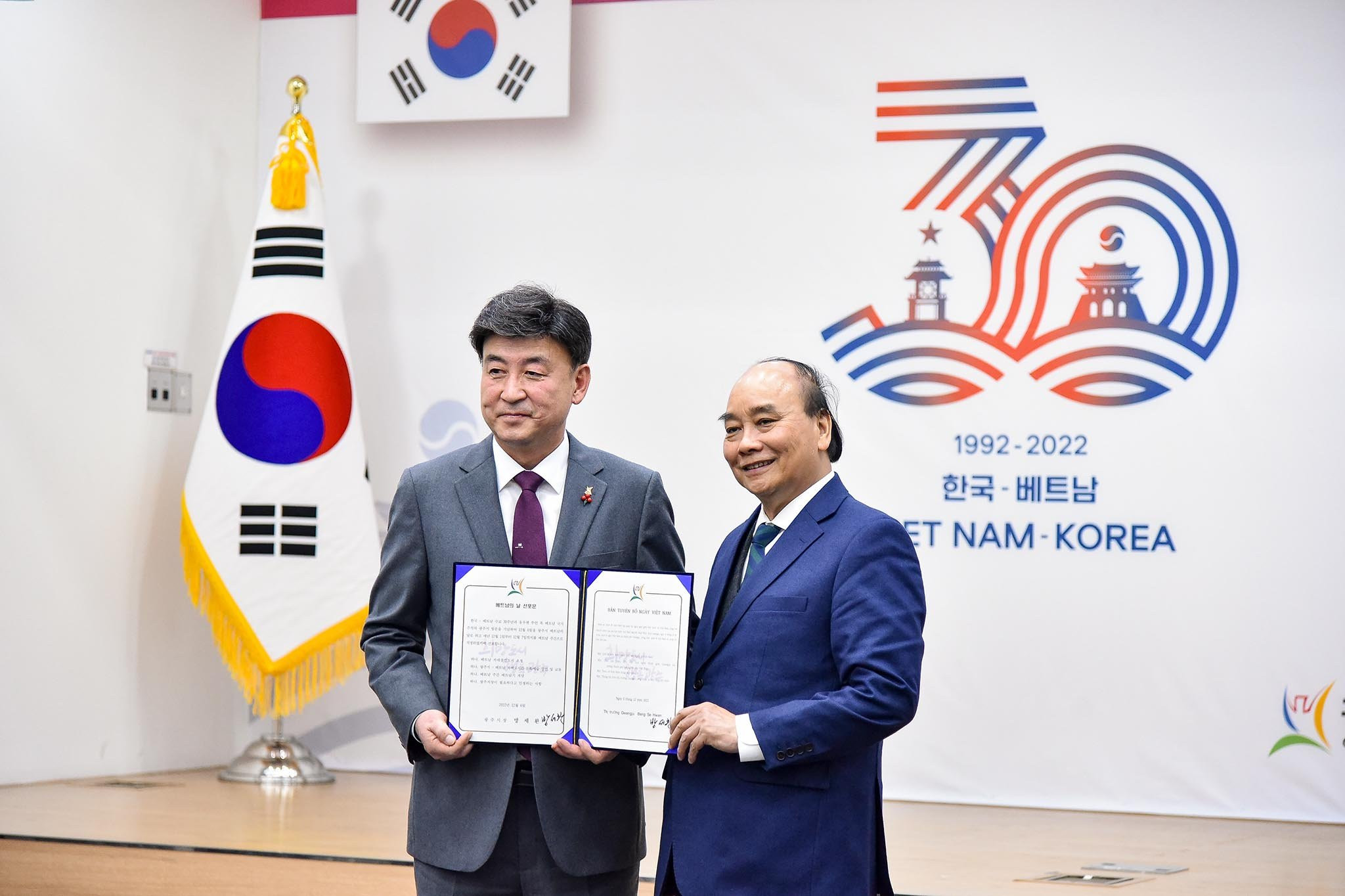Sau hội đàm, Chủ tịch nước Nguyễn Xuân Phúc và Tổng thống Yoon Suk Yeol cùng nhất trí ra Tuyên bố chung về việc nâng cấp quan hệ giữa Việt Nam và Hàn Quốc lên mức Đối tác chiến lược toàn diện, chính thức mở ra chương mới trong quan hệ Việt-Hàn với tương lai tương sáng của hai đất nước, hai dân tộc.
