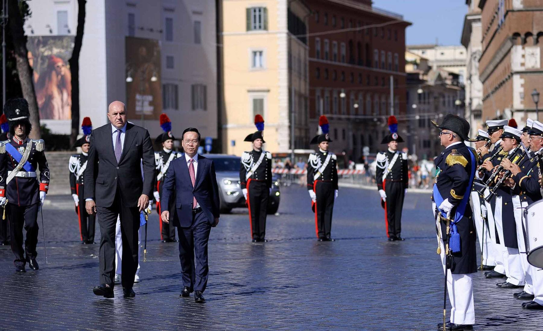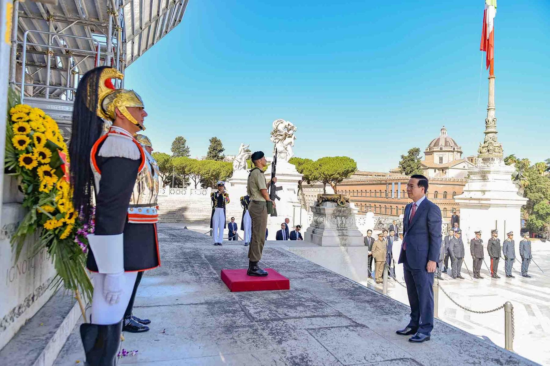 Cũng trong sáng nay, Chủ tịch nước Võ Văn Thưởng đã đặt vòng hoa tại Đài Tổ quốc, nơi tưởng niệm các liệt sĩ vô danh tại thủ đô Rome.