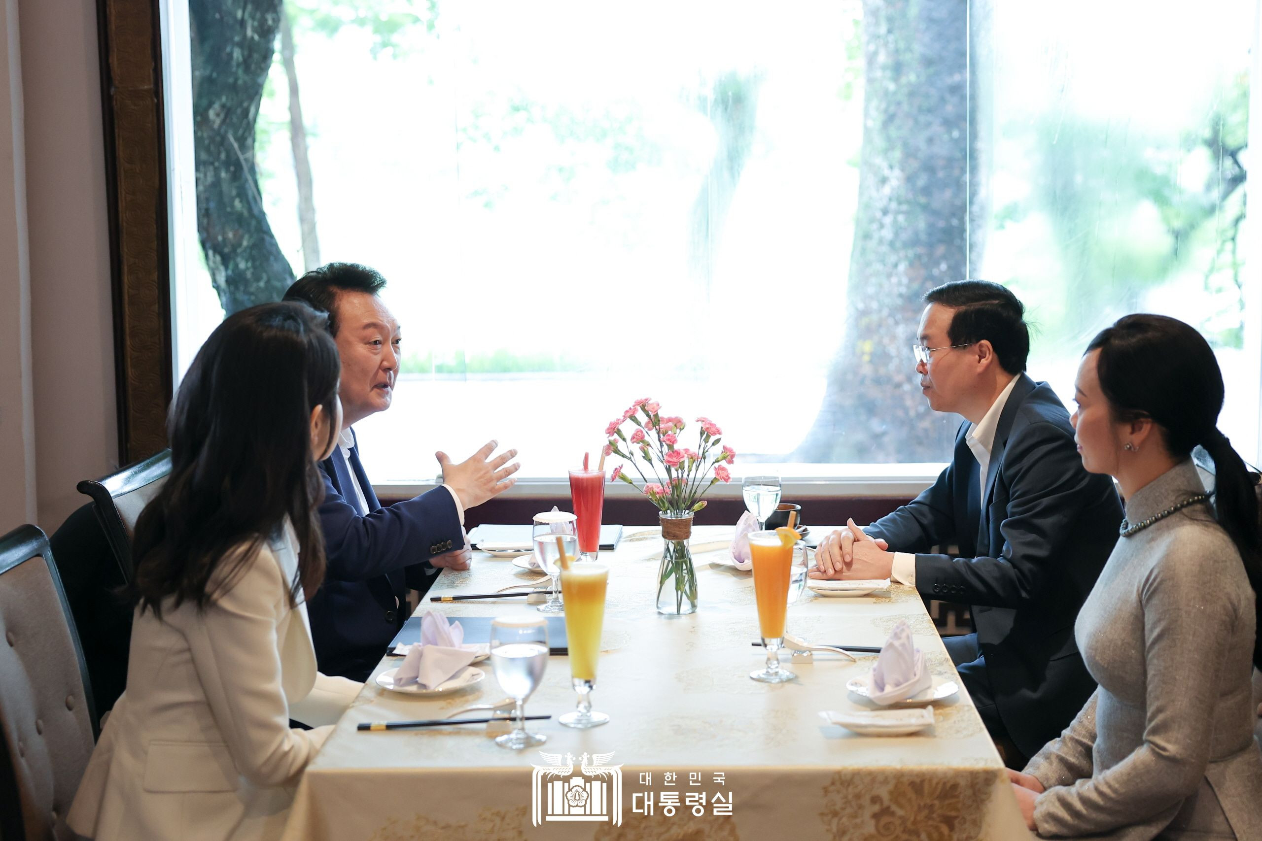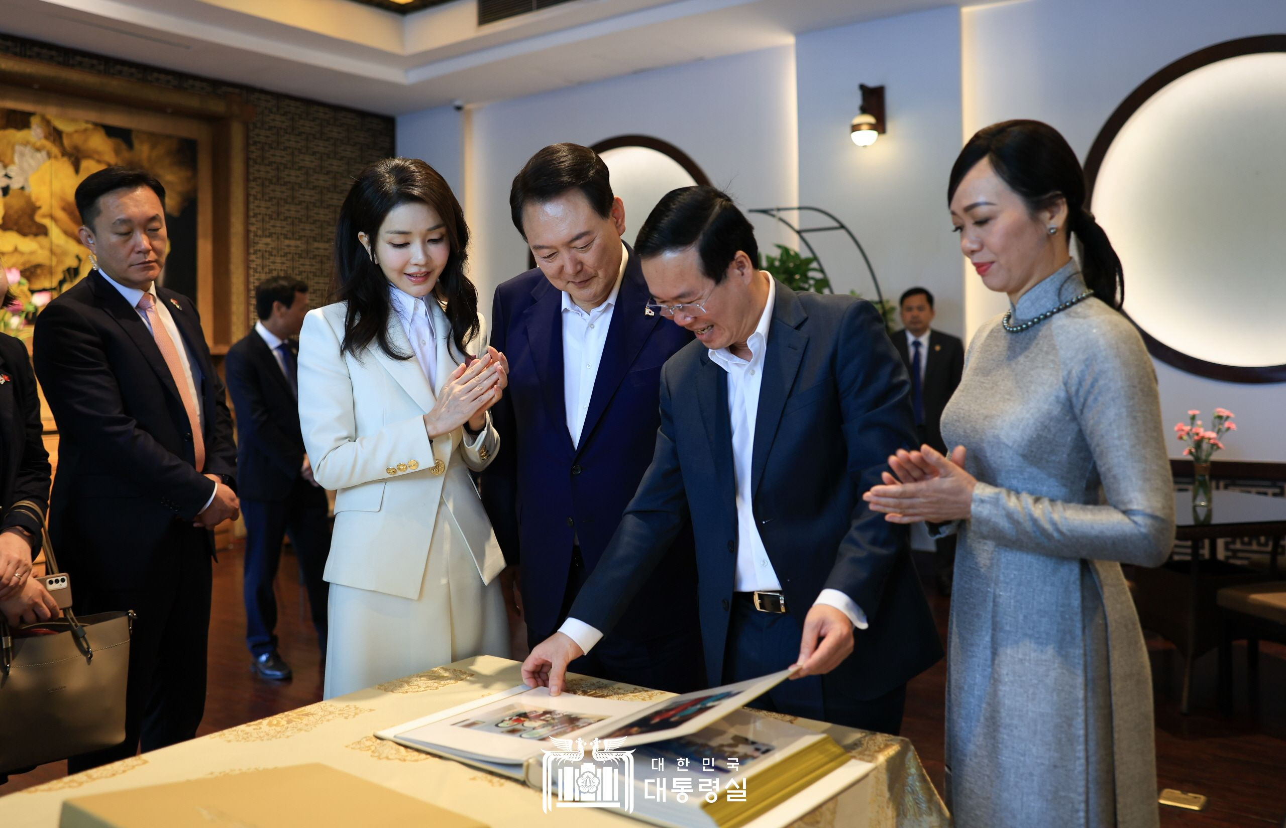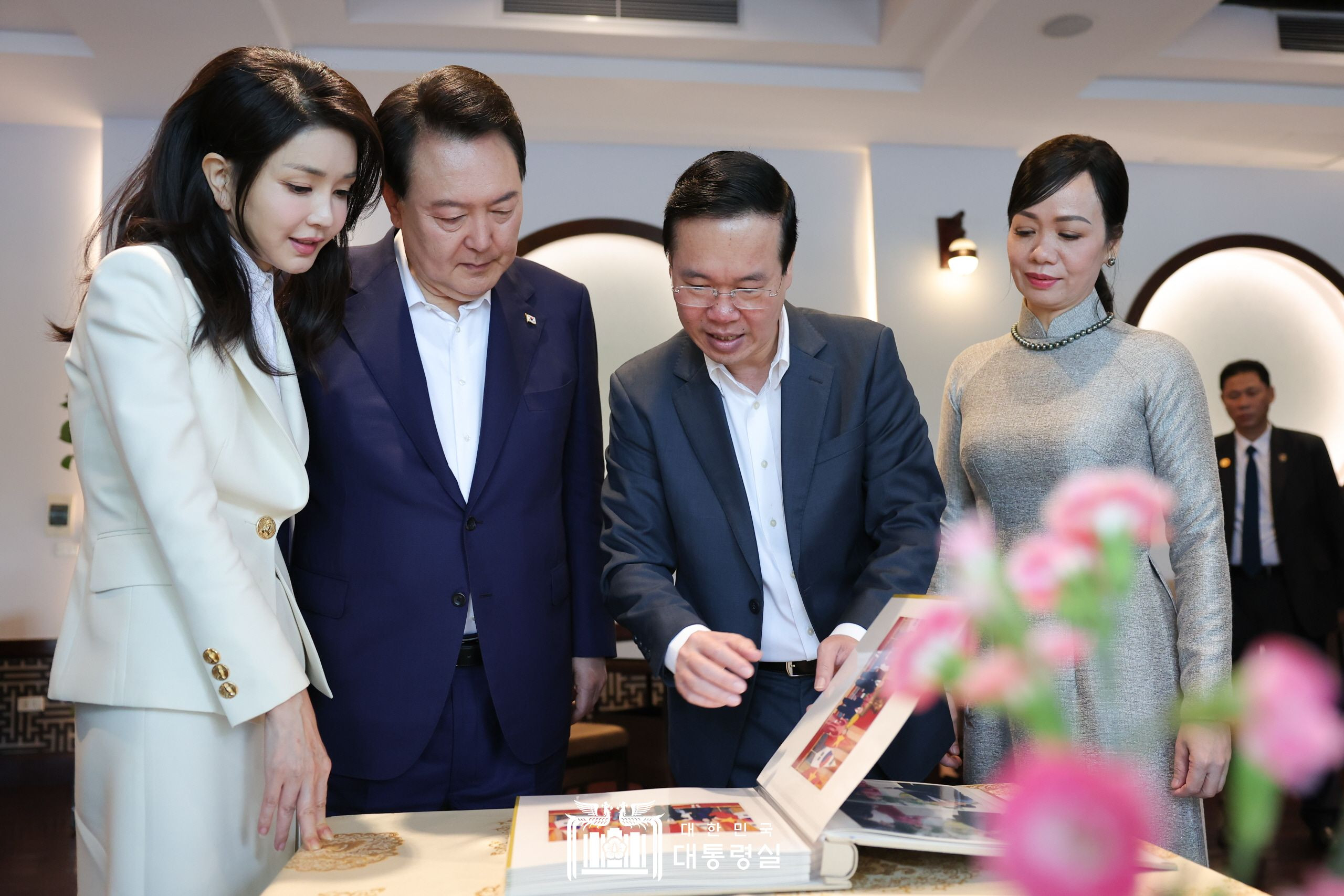 Chủ tịch nước cùng Tổng thống và hai phu nhân thưởng thức ẩm thực Việt trong nhà hàng Lục Thuỷ. Ảnh: Văn phòng Tổng thống Hàn QuốcHai nhà lãnh đạo xem album ảnh ghi lại chuyến thăm 3 ngày tại Việt Nam của Tổng thống Hàn Quốc.