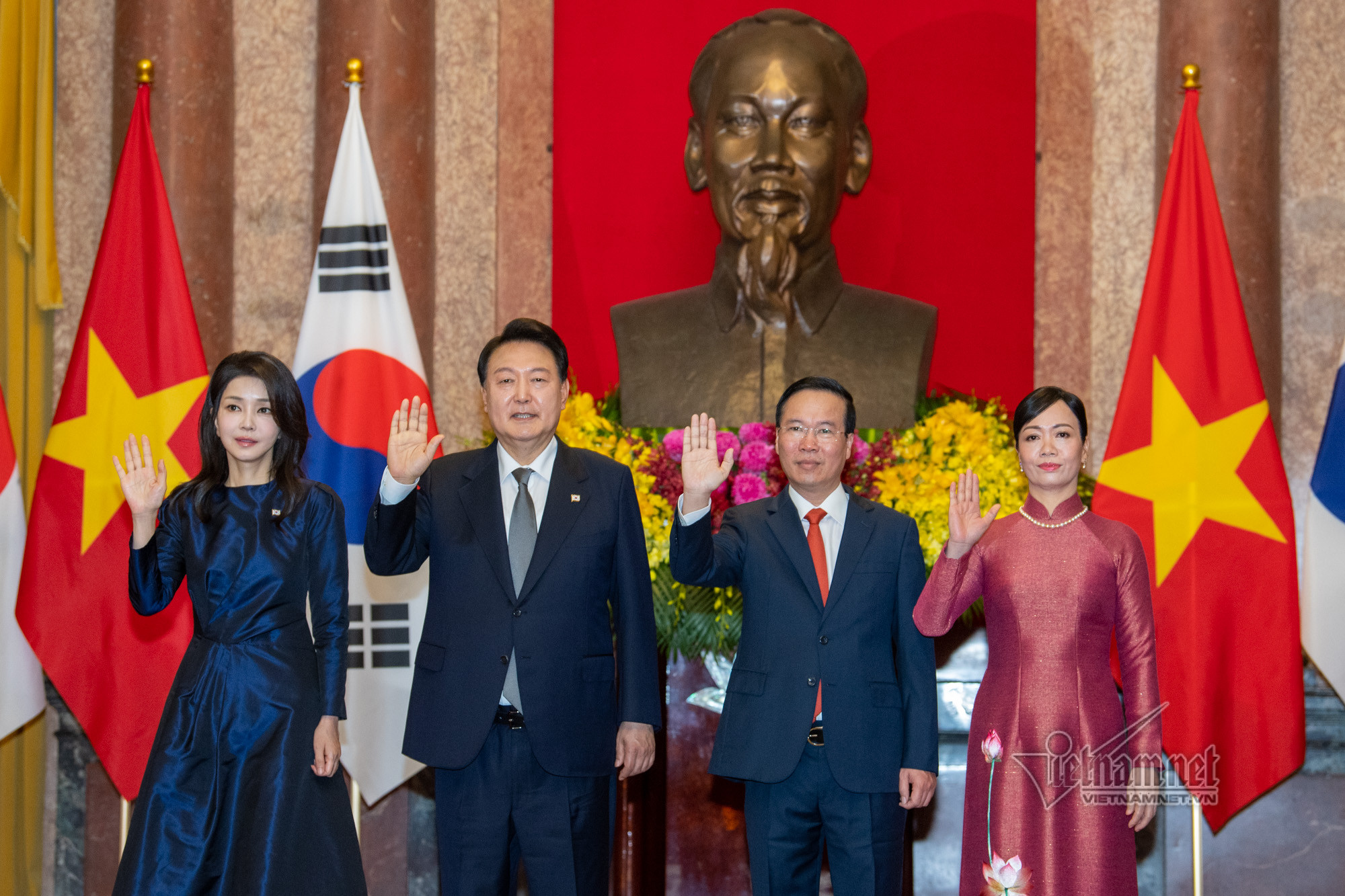 Trong tiếng nhạc chào mừng, Chủ tịch nước Võ Văn Thưởng và phu nhân Phan Thị Thanh Tâm nhiệt liệt chào đón Tổng thống Yoon Suk-yeol và phu nhân Kim Keon-hee thăm cấp Nhà nước tới Việt Nam.
