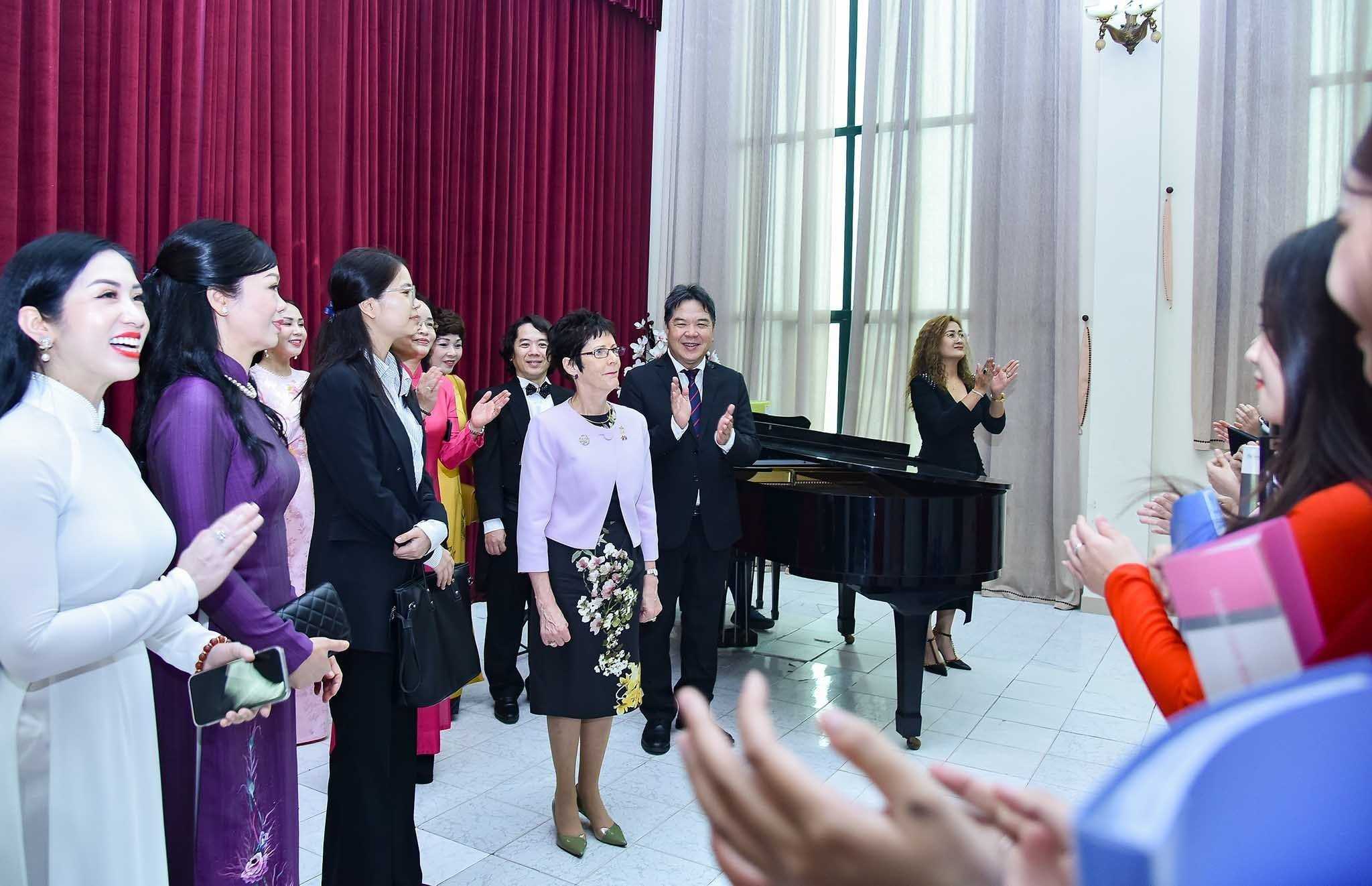 Đón phu nhân Phan Thị Thanh Tâm và phu nhân Linda Hurley tại Học viện Âm nhạc Quốc gia Việt Nam có PGS. TS Lê Anh Tuấn, Giám đốc Học viện cùng cán bộ, giảng viên và 50 sinh viên học viện.
