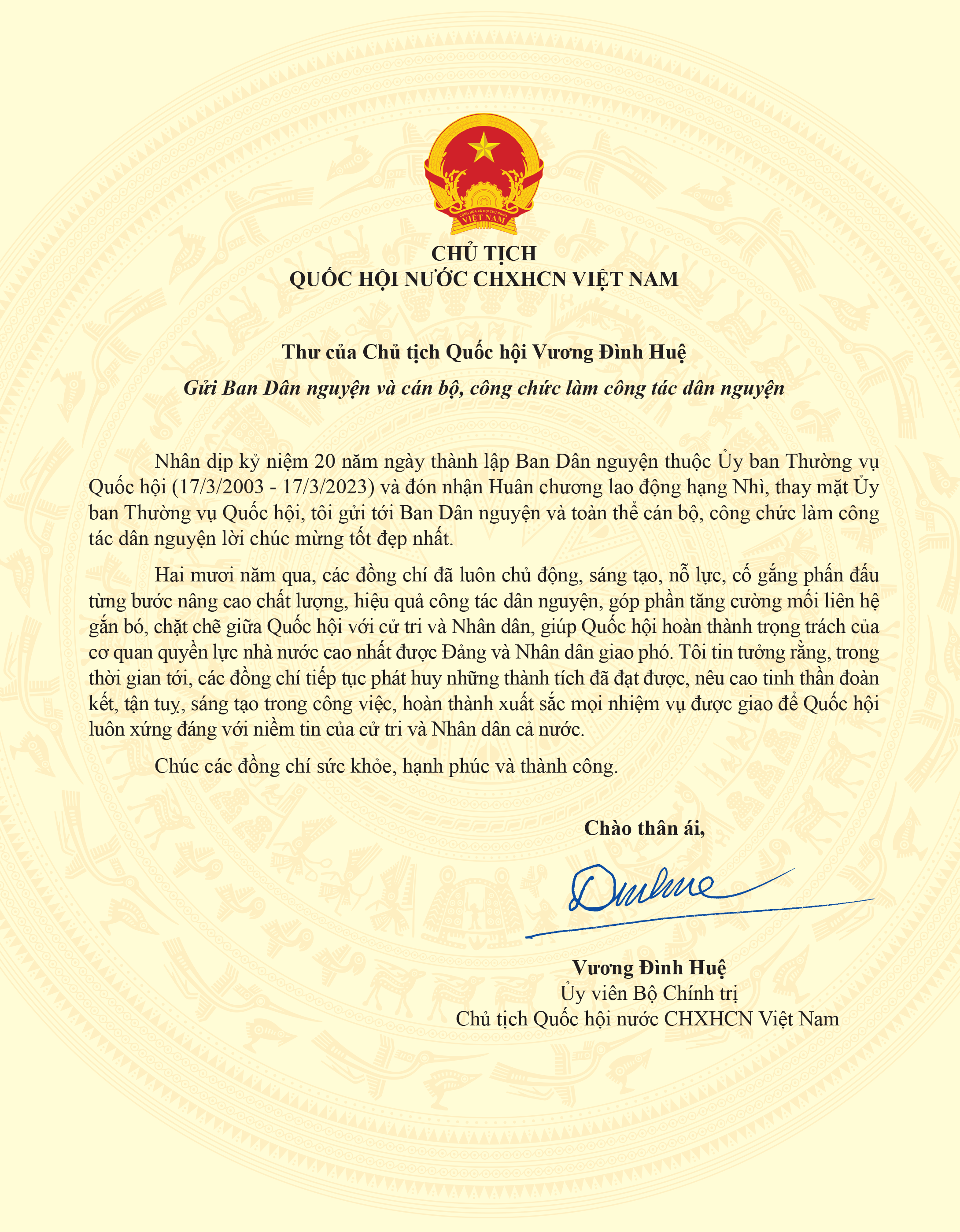 Nhân dịp kỷ niệm 20 năm ngày thành lập Ban Dân nguyện thuộc Ủy ban Thường vụ Quốc hội (17/3/2003 – 17/3/2023) và đón nhận Huân chương lao động hạng Nhì, Ủy viên Bộ Chính trị, Bí thư Đảng đoàn Quốc hội, Chủ tịch Quốc hội Vương Đình Huệ đã có Thư chúc mừng gửi Ban Dân nguyện và cán bộ, công chức làm công tác dân nguyện.