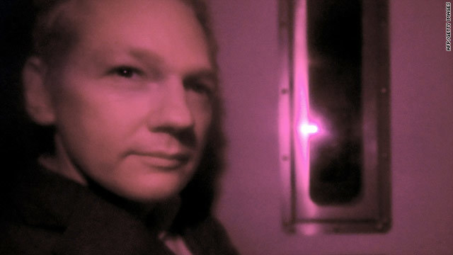 Ảnh: Julian Assange trong xe thùng của cảnh sát (Nguồn: CNN) |