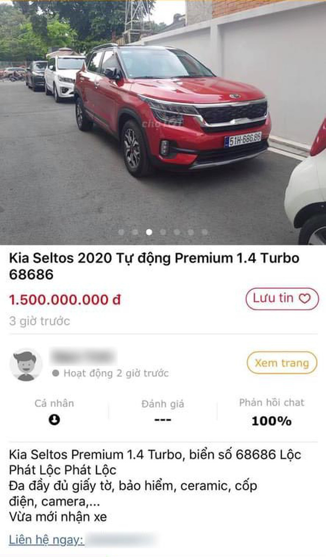 Mới đây, cộng đồng mê xe Việt đã vô cùng xôn xao khi xuất hiện một chiếc Kia Seltos 2020 rao bán với giá 1,5 tỷ đồng. Chiếc xe này thuộc phiên bản Premium 1.4 Turbo có giá niêm yết từ 719 triệu đồng. Lý do chiếc Kia Seltos có giá bán lại cao gấp đôi giá niêm yết là bởi xe sở hữu dãy biển số đẹp "68.686", đăng ký tại TP.Hồ Chí Minh.