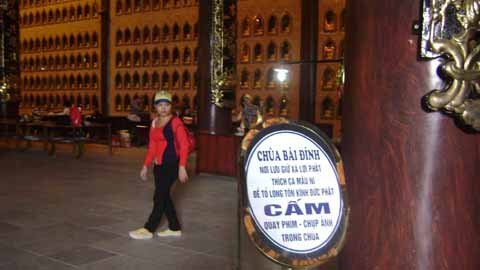 Trong Điện thờ Phật A Di Đà có ghi dòng chữ " Chùa Bái Đính nơi lưu giữ xá lợi Thích Ca Mâu Ni để tỏ lòng tôn kính Đức Phật. Cấm quay phim – chụp ảnh trong chùa", nhưng dường như chỉ đúng phần câu trên còn xung quanh mọi người thăm quan đều thoải mái tự nhiên chụp ảnh. Ngoài hành lang, trước mỗi tòa điện đều hiện diện rất đông người ăn xin, nhiều du khách không khéo với họ còn nhận được những lời lẽ khó nghe.