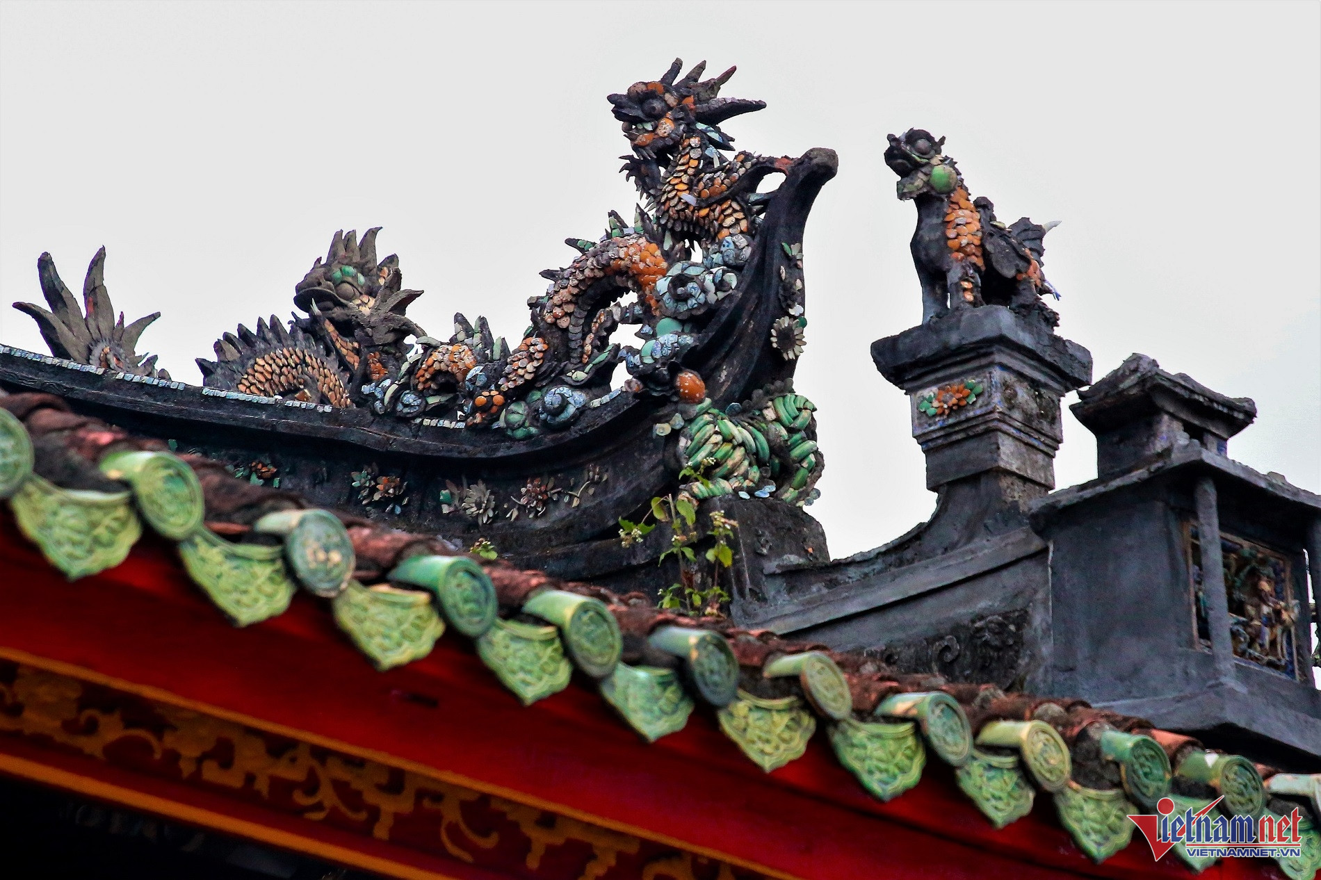 Tam Quan được lợp ngói âm dương với mái cong vút, tô điểm bằng những con rồng uốn lượn và 2 bên là cặp sư tử đá, biểu tượng cho sự uy quyền và trang trọng.