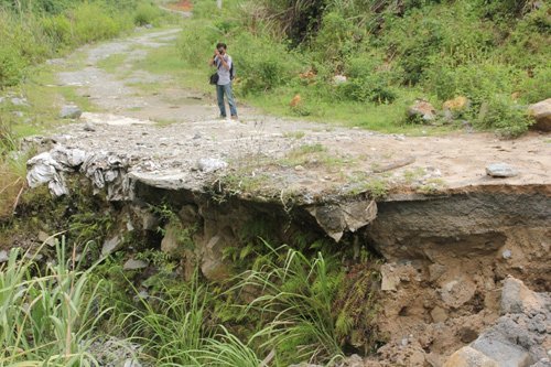 | Trận rung chấn đã gây sạt lở đất ngay đường tránh (dấu vết mới) dưới chân đập Sông Tranh 2. |