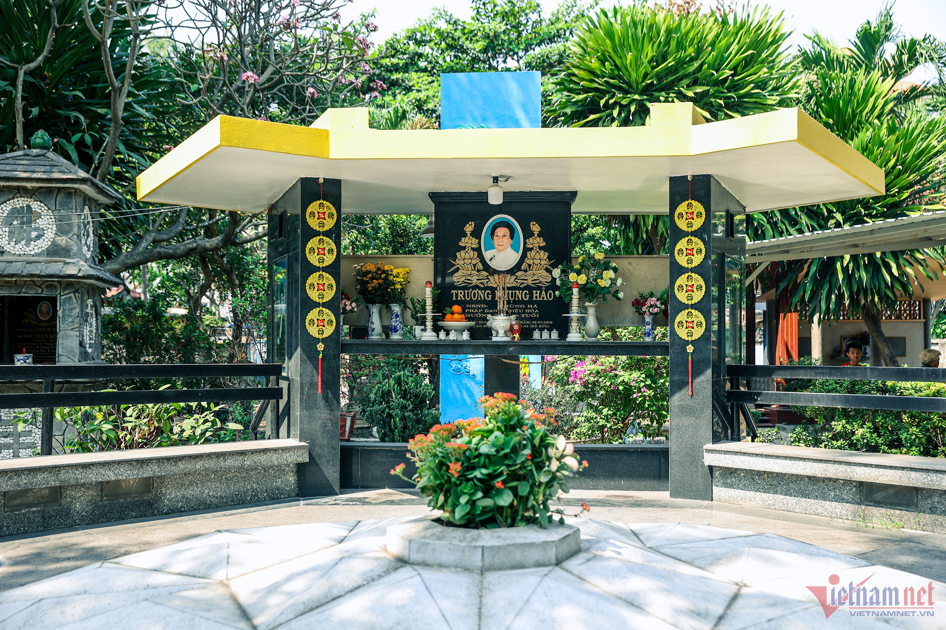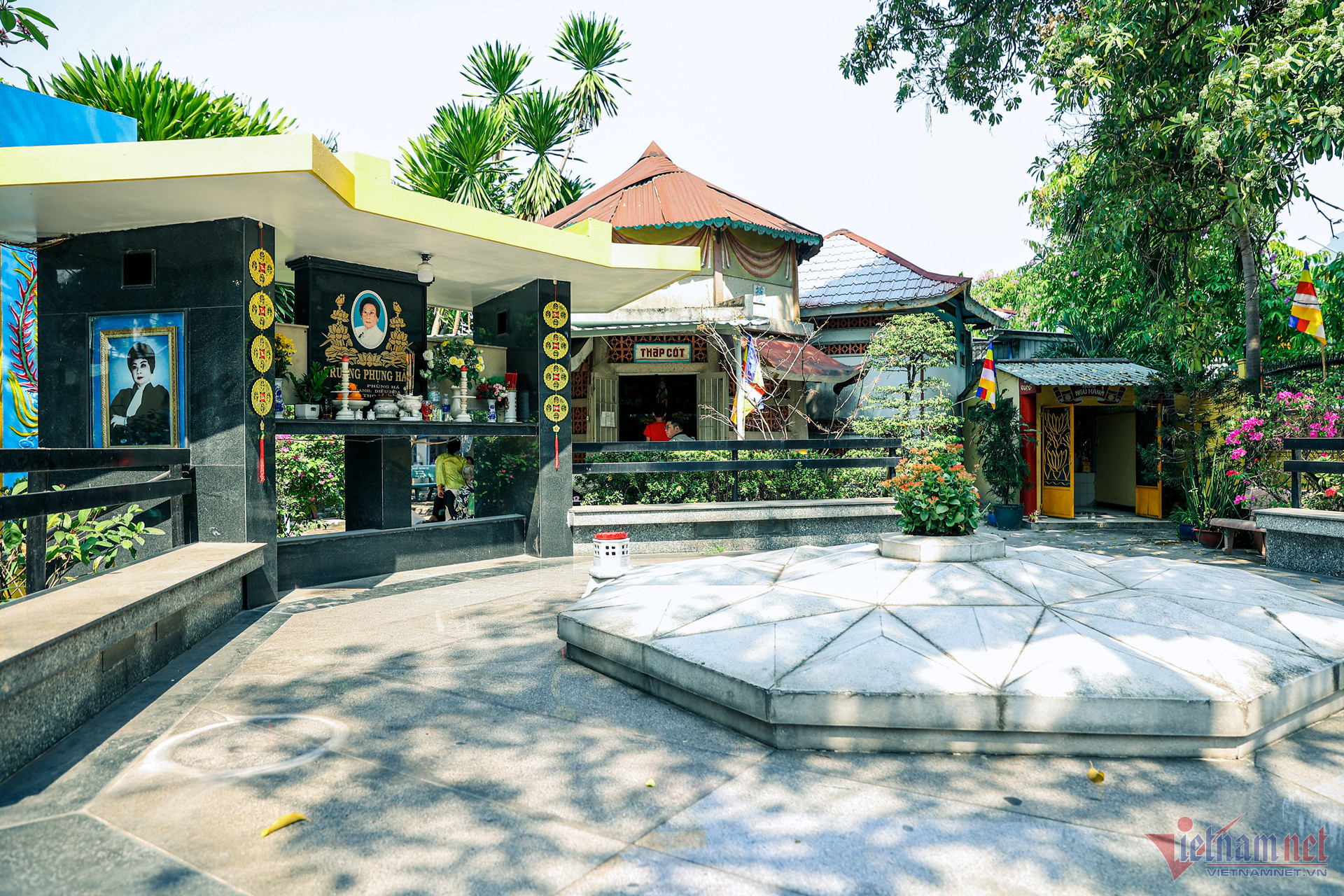 Mộ phần NSND Phùng Há - người có công xây chùa - luôn sạch sẽ, trang nghiêm. Từ khi NSND mất, cháu ruột - bà Nguyễn Thị Bích Qua - 'định cư' tại đây lo coi sóc, hương khói cho bà ngoại.