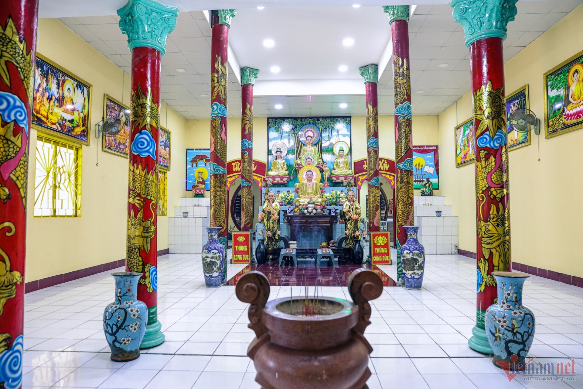 Khu vực Chánh điện được thi công chống thấm trần, sơn lại cột rồng, tôn nghiêm và sáng sủa.