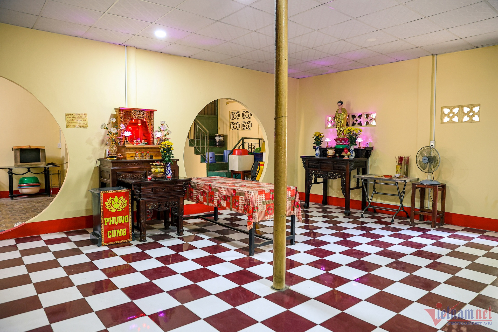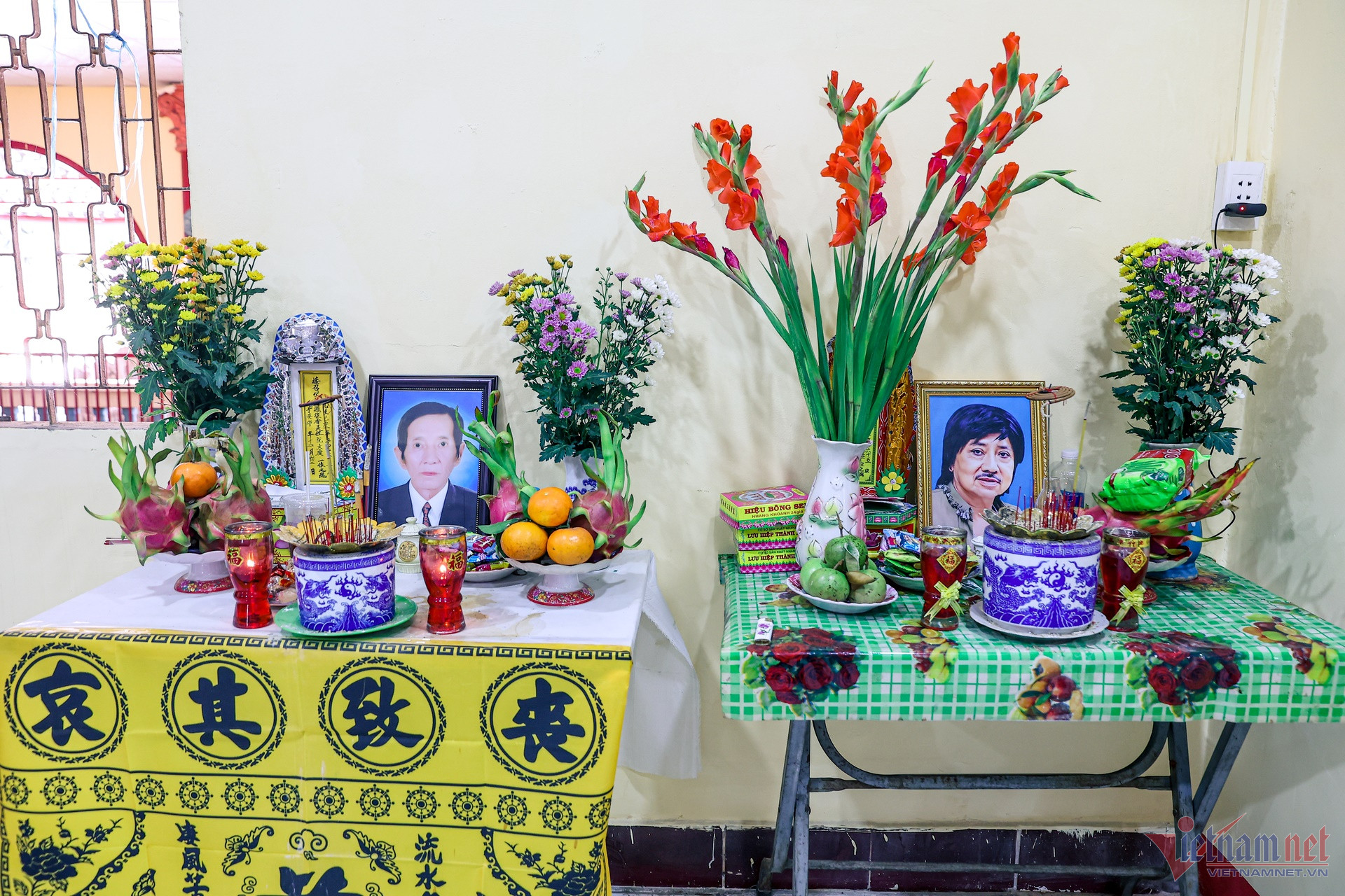 Một góc phòng thờ Tổ đặt bàn thờ ông Nguyễn Văn Độ (trái) và diễn viên Aly Dũng (bên phải) đang trong giai đoạn 49 ngày. Ông Nguyễn Văn Độ (hay Chín Độ) thời trẻ là công nhân sân khấu, tuổi già nương nhờ cửa chùa. Sinh thời, ông phụ trách chính khu vực nghĩa trang.