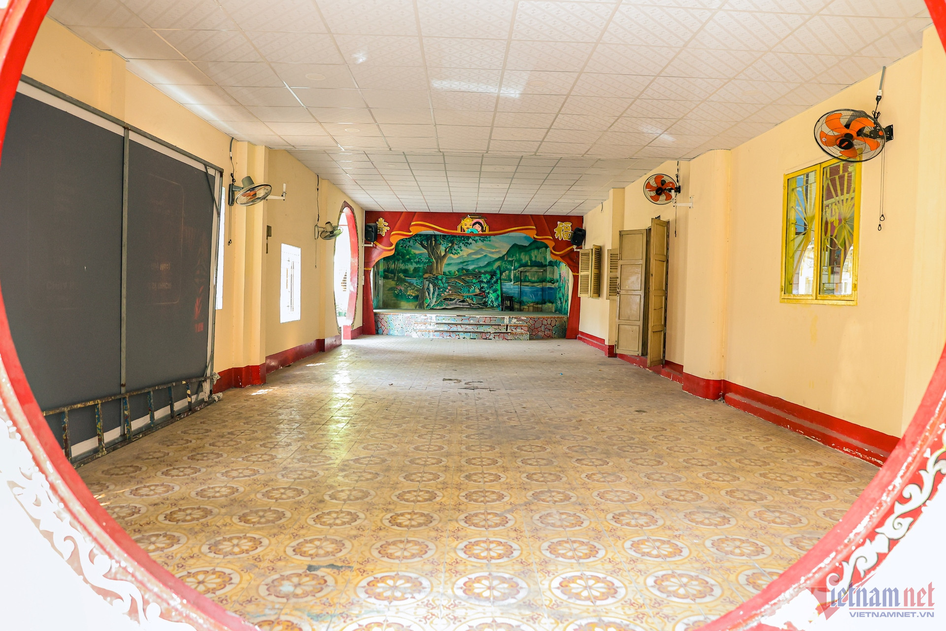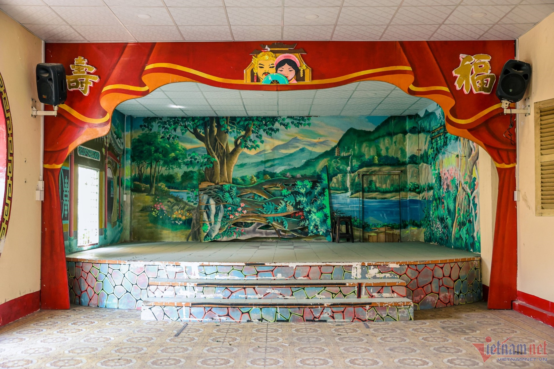 Sân khấu nằm bên trái khu vực Chánh điện, là một trong những khu vực chức năng chính của chùa. Sau khi được cải tạo, không gian này sẽ là nơi các đoàn hát biểu diễn hoặc tổ chức tiệc dịp lễ lạt, hội hè. Ngày thường, nơi đây được NSND Trịnh Kim Chi đề xuất tận dụng làm nơi tổ chức tang lễ cho những nghệ sĩ nghèo không đủ khả năng hoặc không có người lo hậu sự.