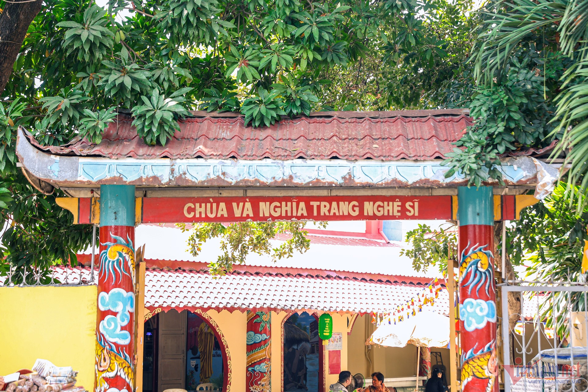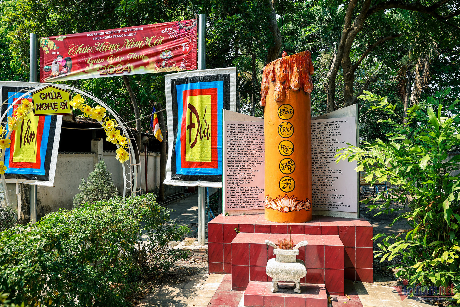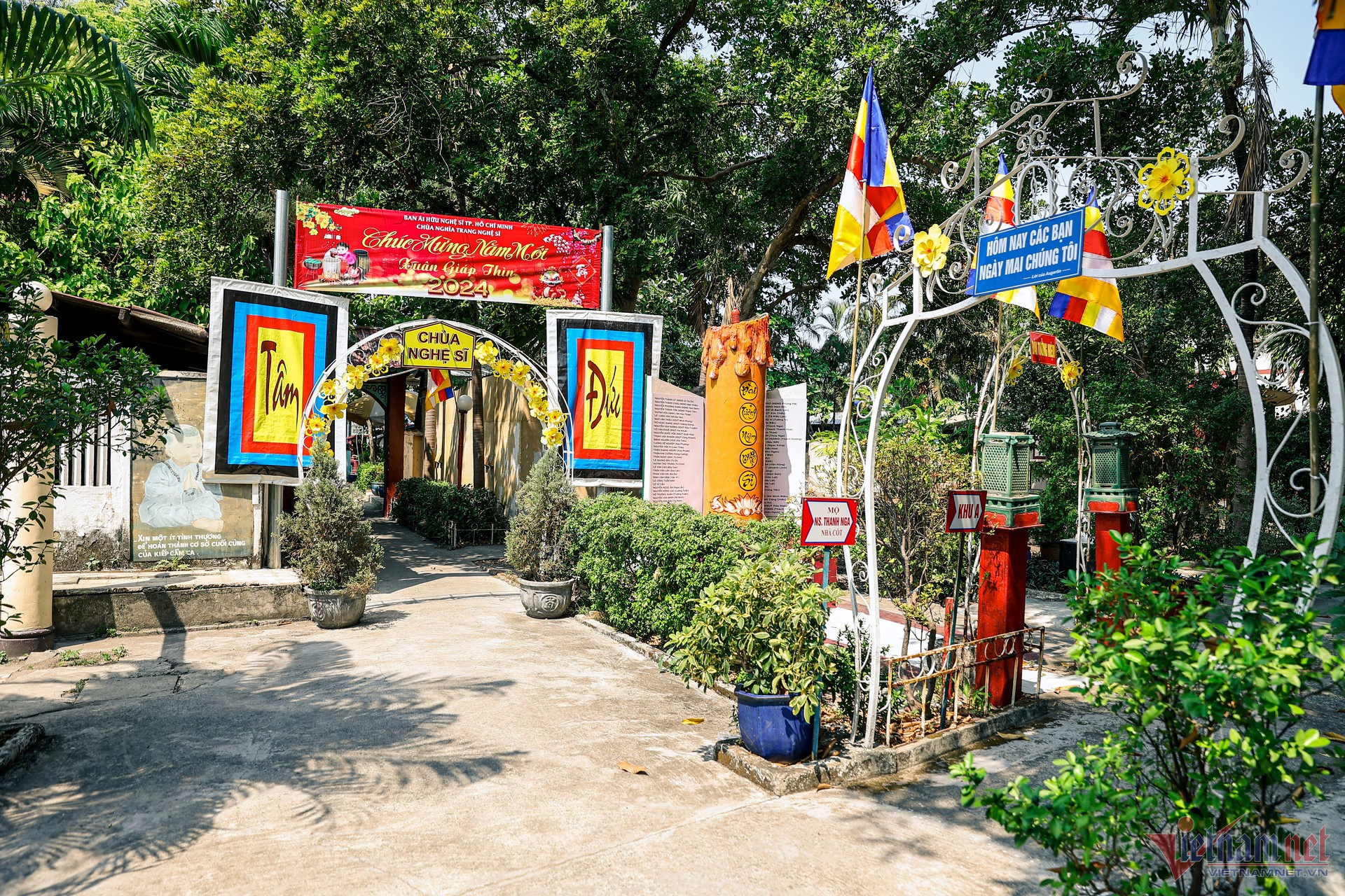 Trước thềm Tết Giáp Thìn 2024, phóng viên VietNamNet đến thăm Chùa Nghệ sĩ - một trong những di sản văn hóa của TP.HCM. Từ bên ngoài, ngôi chùa nổi bật với sắc vàng, đỏ rực rỡ.