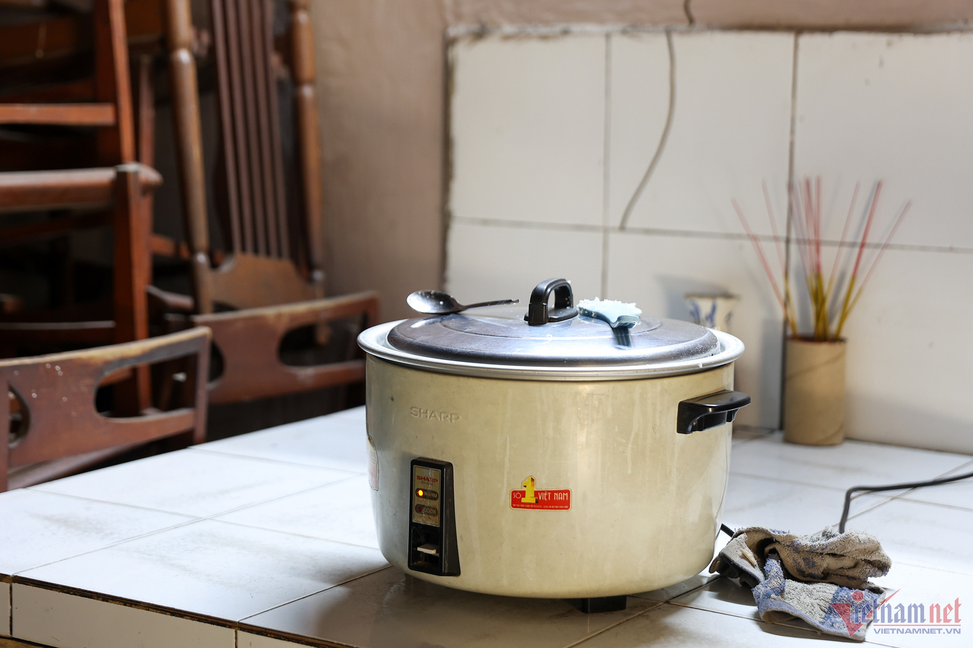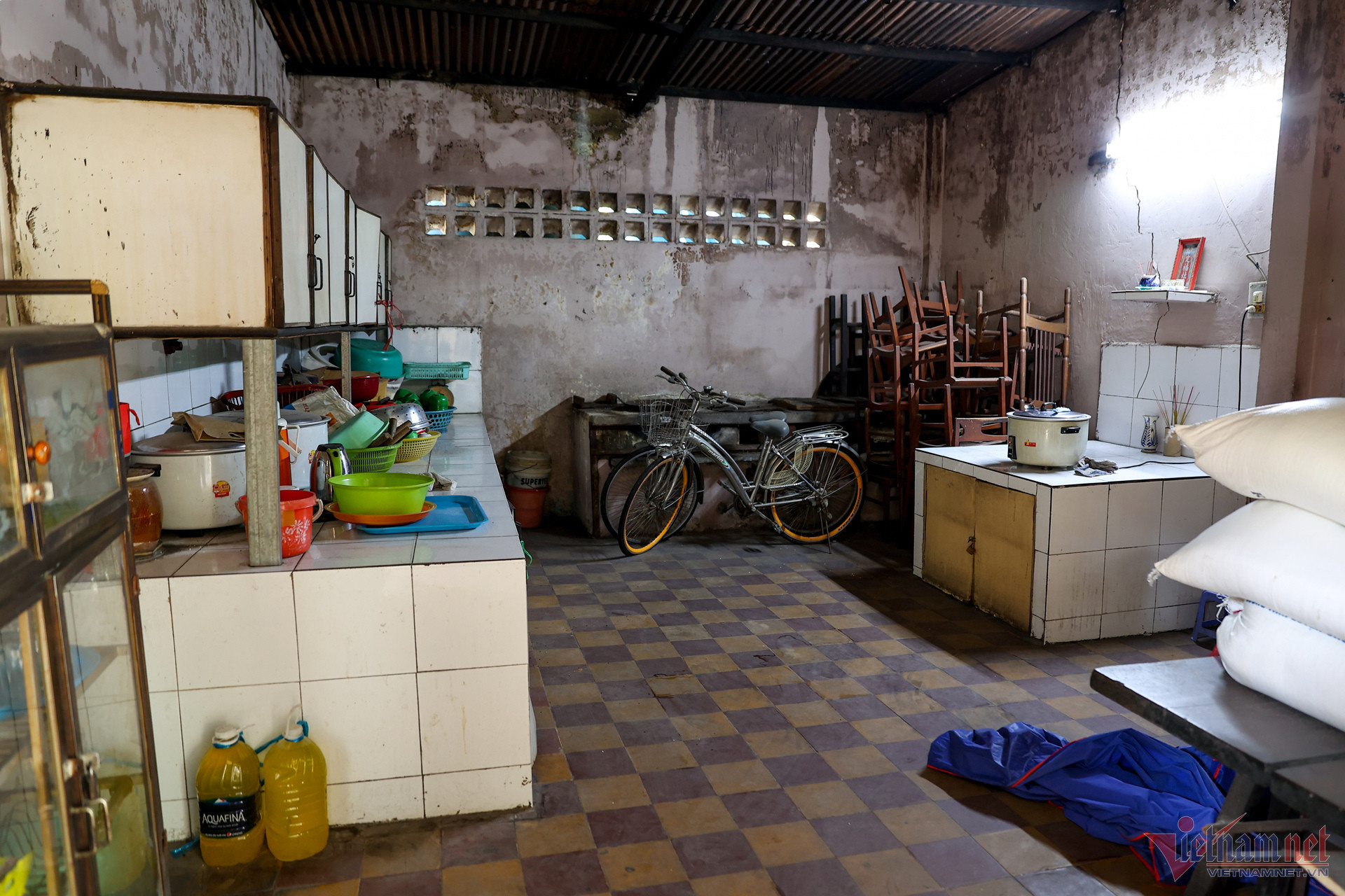 Nhà bếp cũng thuộc hạng mục được sửa. Mỗi ngày, những người sống ở chùa nấu chung 1 nồi cơm to từ gạo Phật tử cúng dường, tự túc thức ăn.