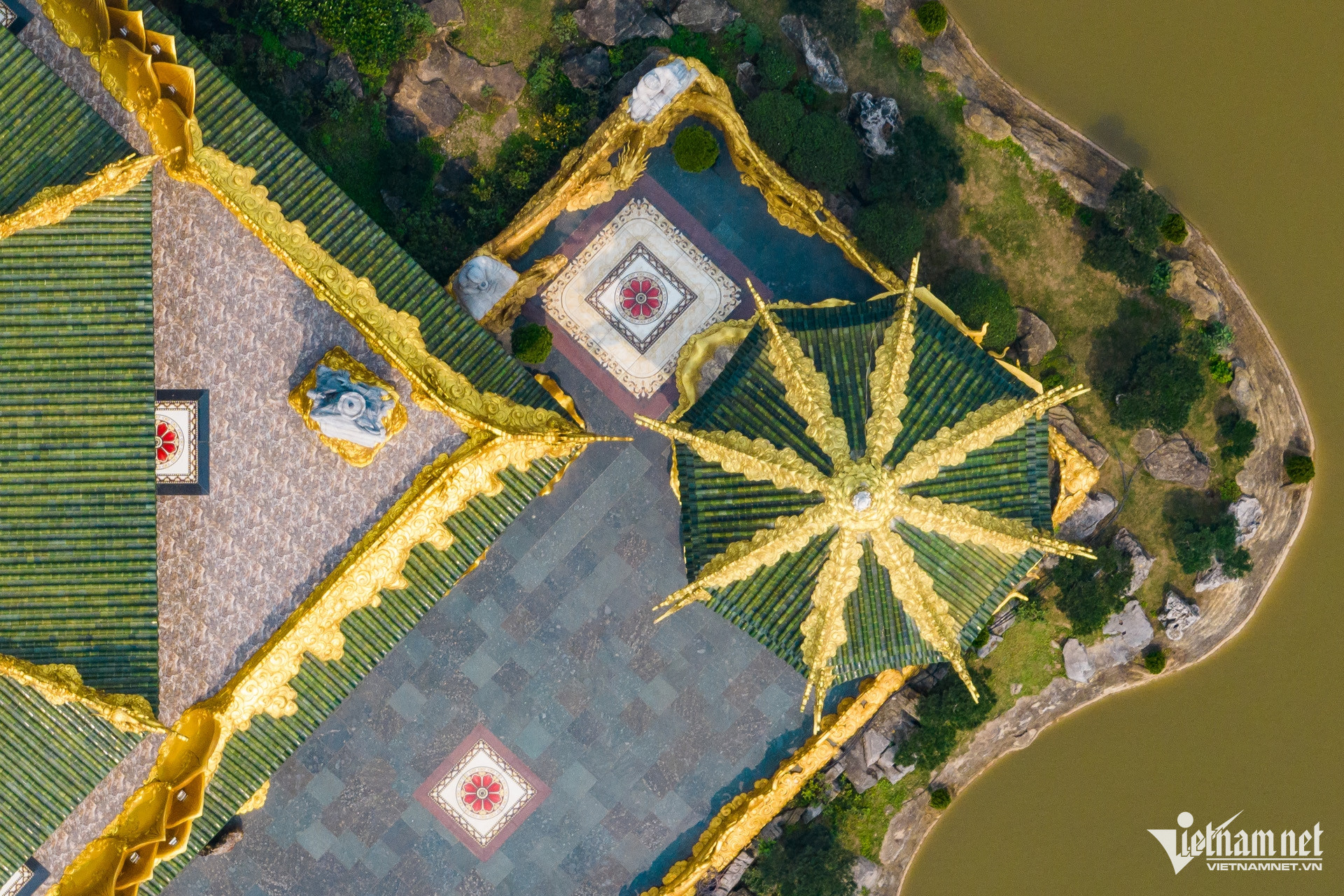 Lan can tầng hai được trang trí bằng những cánh sen lớn đang nở rộ, tạo nên nét đẹp khác biệt với các ngôi chùa khác.