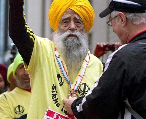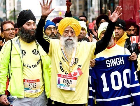 Fauja, đến từ Ilford, đông London, trở thành người đầu tiên hoàn thành một cuộc marathon ở tuổi 100 tại Toronto trước mặt các thành viên của Tổ chức Kỷ lục Thế giới Guinness.