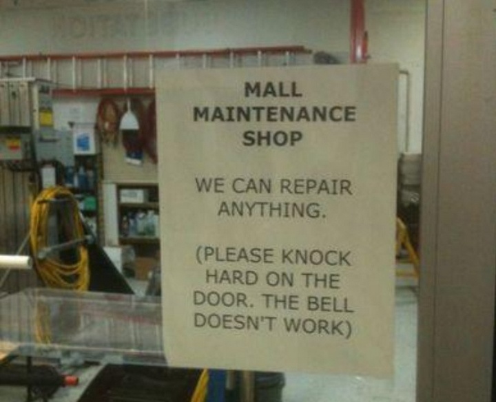 Cửa hàng này nói rằng "Chúng tôi có thể sửa mọi thứ", ấy vậy mà đến cái chuông cửa cũng bị hỏng và phải bảo khách gõ cửa thật mạnh