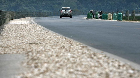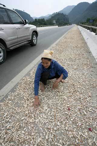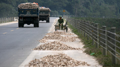 | Toàn bộ phần đường giành cho xe thô sơ và xe máy được người dân chiếm làm chỗ phơi sắn (huyện Lạc Sơn – Hòa Bình) |