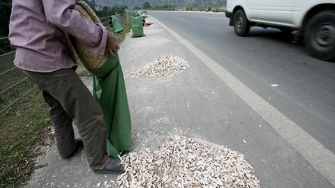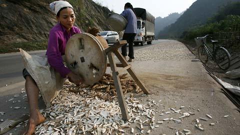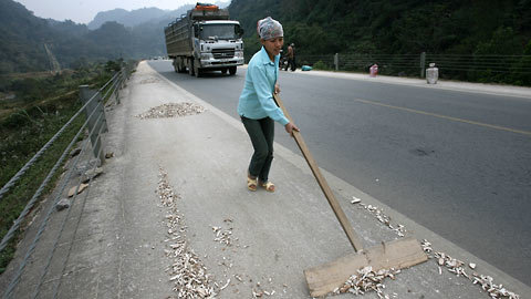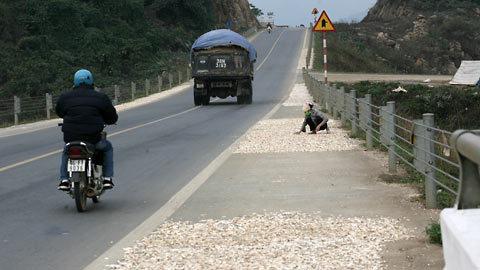 | Không quan tâm đến những chiếc ô tô hạng nặng chạy rầm rập, người phụ nữ này thản nhiên làm việc như sân phơi nhà mình (huyện Thạch Thành – Thanh Hóa) |