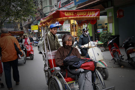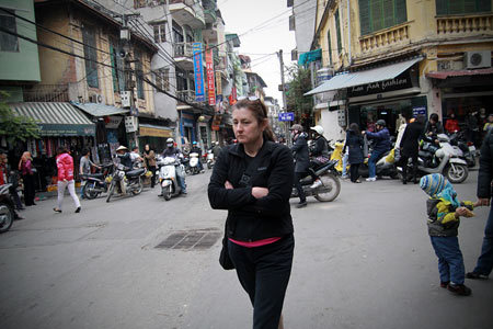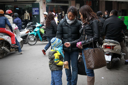 | Một người nước ngoài co ro vì lạnh trên phố cổ Hà Nội |
