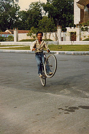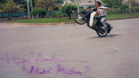 | Chí Anh làm xiếc với xe đạp và xe máy. |