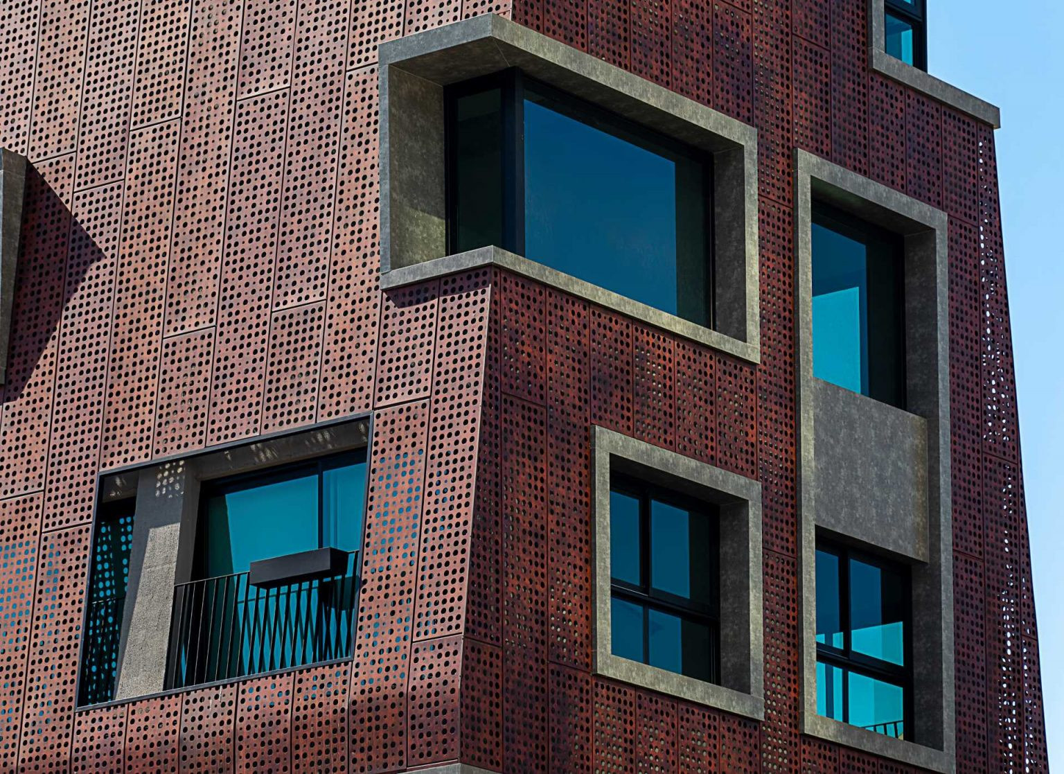 Lớp kim loại này che mặt tiền toà nhà khỏi ánh nắng trực tiếp, cung cấp đủ ánh sáng tự nhiên cho các căn hộ, cho phép người trong nhà quan sát được khu vực xung quanh nhưng vẫn đảm bảo sự riêng tư cho chủ nhân.