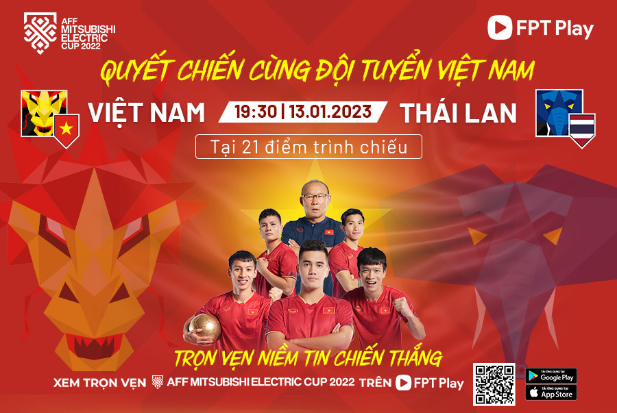 Đón xem các trận chung kết AFF Cup 2022 trên trên hệ thống FPT Play vào 19h30 ngày 13/01 và 16/01. Là đơn vị sở hữu bản quyền phát sóng AF Cup 2022, FPT Play sẽ mang đến trọn vẹn không khí kịch tính của loạt trận chung kết tại: Website: fptplay.vn Ứng dụng FPT Play: https://fptplay.vn/ung-dung/download Fanpage Truyền hình FPT Play: https://www.facebook.com/truyenhinhfptplayofficial YouTube kênh FPT Bóng đá Việt: https://www.youtube.com/channel/UCljFFNaQoJWeP91Bz4m_3bw ![]() Với mong muốn gắn kết người hâm mộ và lan tỏa tình yêu bóng đá đến cộng đồng, FPT Play sẽ tổ chức 21 sự kiện xem tập trung tại các tỉnh thành trong thời gian diễn ra trận chung kết lượt đi AFF Cup 2022 giữa đội tuyển Việt Nam và Thái Lan. Trong đó có: đại lộ Lê Duẩn (TP.HCM), sân vận động Lạch Tray (Hải Phòng), phố đi bộ TP. Vinh (Nghệ An), quảng trường TP. Bắc Giang… Danh sách các điểm xem được cập nhật liên tục tại fanpage FPT Play https://www.facebook.com/fptplay. Thông tin chi tiết liên hệ hotline: 19006600. |