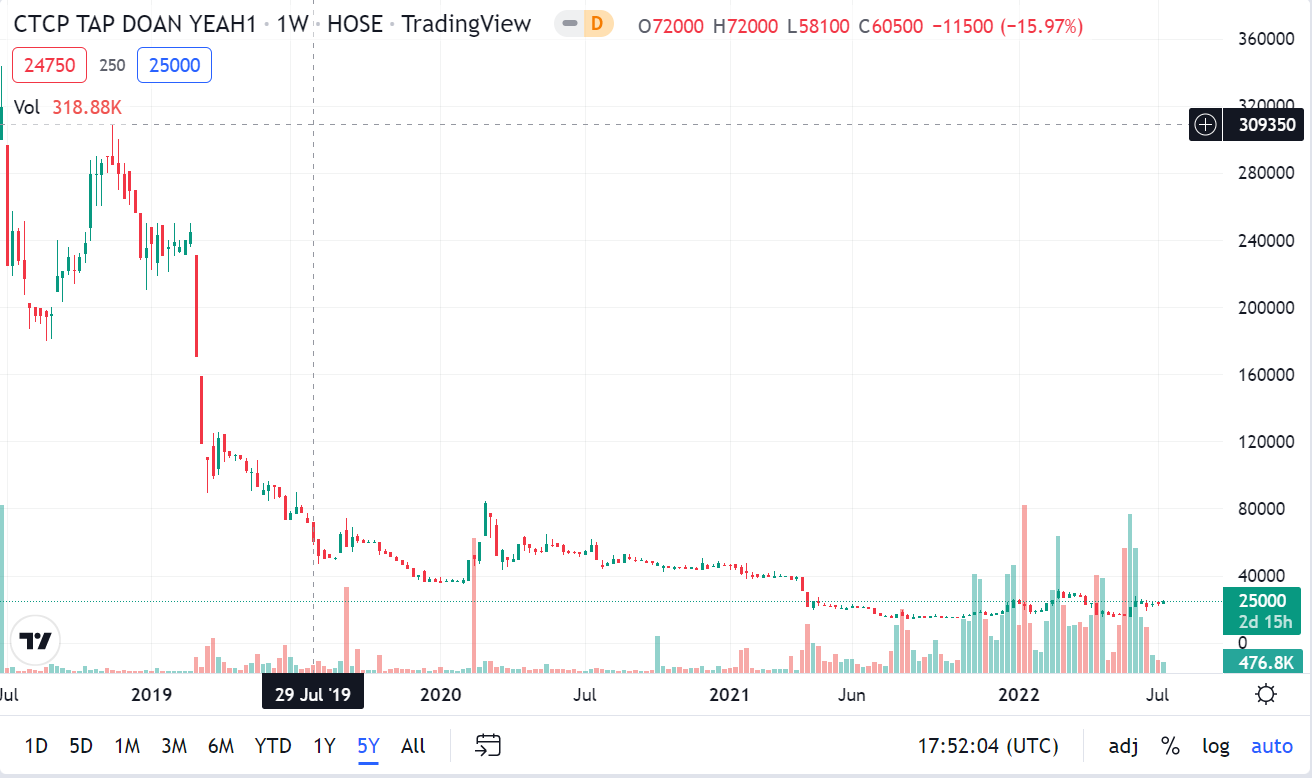 Nếu tính từ đầu năm 2019 đến cuối tháng 8/2019, YEG mất hơn 3/4 giá trị, từ vùng giá 235.000 đồng/cp xuống 50.700 đồng/cp. Hiện trên thị trường chứng khoán, cổ phiếu YEG rơi về vùng đáy khi chốt phiên ngày 12/7 ở mức 25.000 đồng/cp