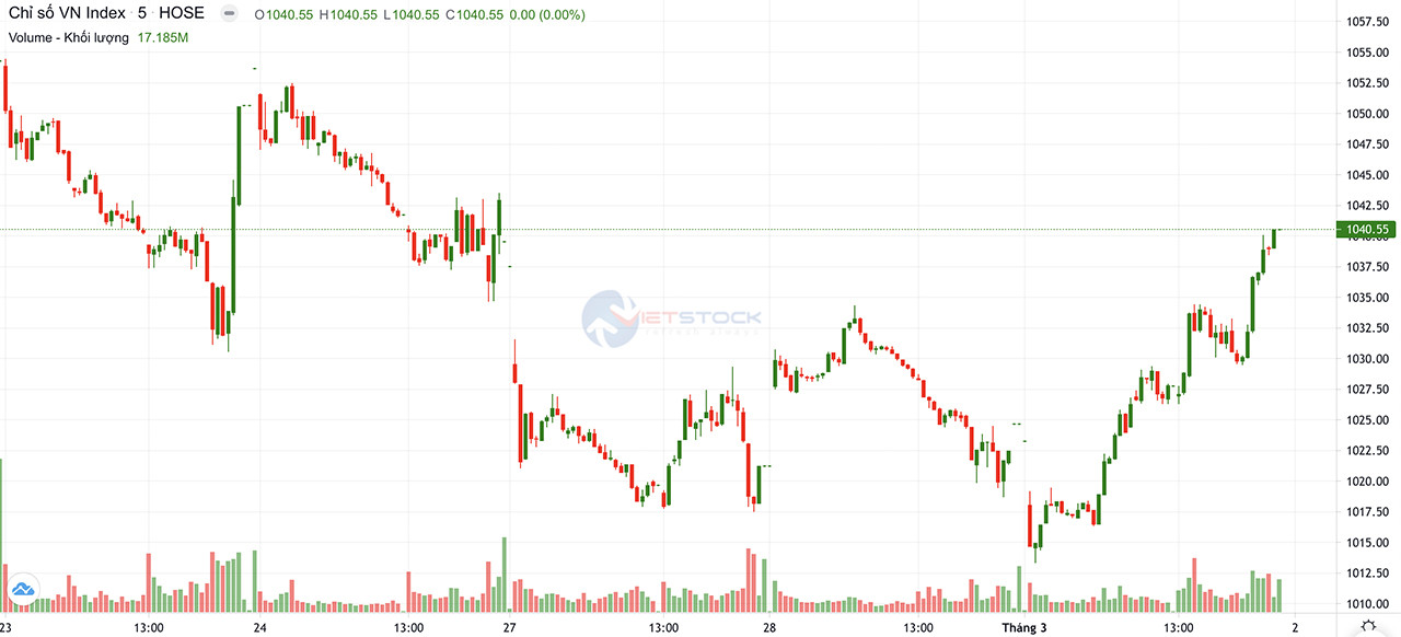 Kết phiên 1/3, VN-Index tăng 15,87 điểm (+1,55%), lên 1.040,55 điểm. HOSE có 290 mã tăng, 106 mã giảm. Tổng khối lượng giao dịch đạt 523,6 triệu đơn vị, giá trị giao dịch đạt 8.261,8 tỷ đồng.