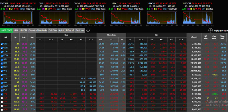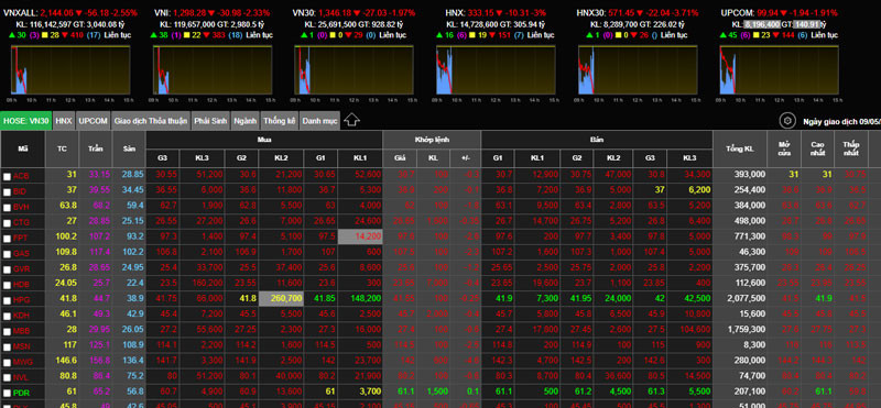 Chốt phiên giao dịch chiều 9/5, chỉ số VN-Index giảm 59,64 điểm xuống 1.269,64 điểm. Chỉ số HNX-Index của sàn Hà Nội cũng giảm mạnh 20,08 điểm xuống 323,39 điểm. Upcom-Index giảm gần 6 điểm xuống ngưỡng 96 điểm. Thanh khoản khá thấp, đạt tổng cộng 21,3 nghìn tỷ đồng, trong đó có 18,6 nghìn tỷ đông trên sàn HOSE.