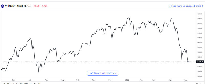 Như vậy so với ngưỡng 1.524 điểm hồi đầu tháng 4, chỉ số VN-Index đã mất hơn 220 điểm, tương đương giảm gần 15%. Vốn hóa thị trường chứng khoán bốc hơi khoảng 40 tỷ USD.