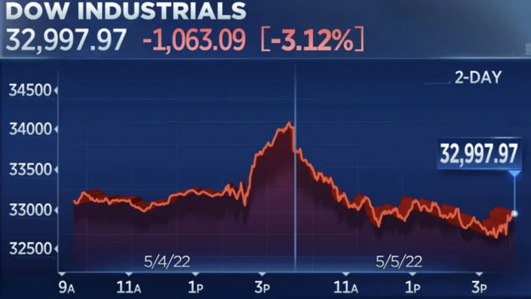 Cụ thể, kết thúc phiên giao dịch 5/5 (rạng sáng 6/5 giờ Việt Nam), chỉ số công nghiệp Dow Jones mất 1.063 điểm (tương đương giảm 3,12%). Chỉ số công nghệ Nasdaq Composite sụt giảm 4,99% và xuống mức thấp nhất kể từ tháng 11/2020.