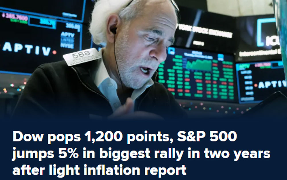 Chứng khoan Mỹ tăng vọt sau khi dữ liệu chỉ số giá tiêu dùng (CPI) tháng 10 giúp nhà đầu tư gia tăng hy vọng rằng lạm phát đã đạt đỉnh.
