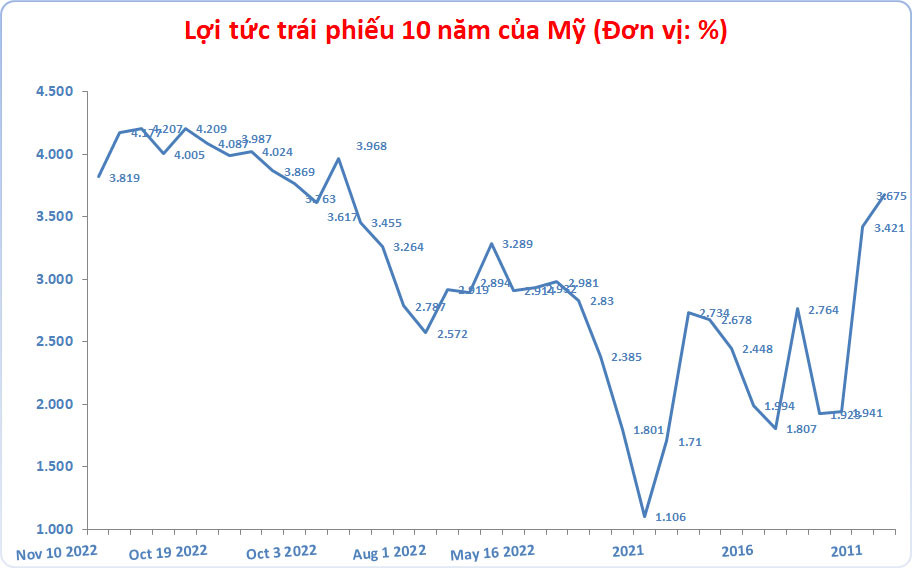 Lợi suất trái phiếu kỳ hạn 10 năm của Mỹ giảm nhanh xuống 3,81%, so với mức đỉnh trên 4,2%/năm ghi nhận hồi đầu tháng 11.