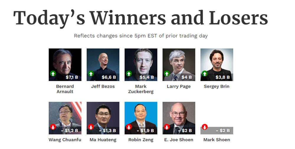 Chứng khoán tăng mạnh giúp ông Jeff Bezos (Amazon) có thêm 6,6 tỷ USD và ông chủ Facebook Mark Zuckerberg có thêm 5,4 tỷ USD. Tỷ phú giàu số 1 thế giới Elon Musk có tài sản hơn 196 tỷ USD.
