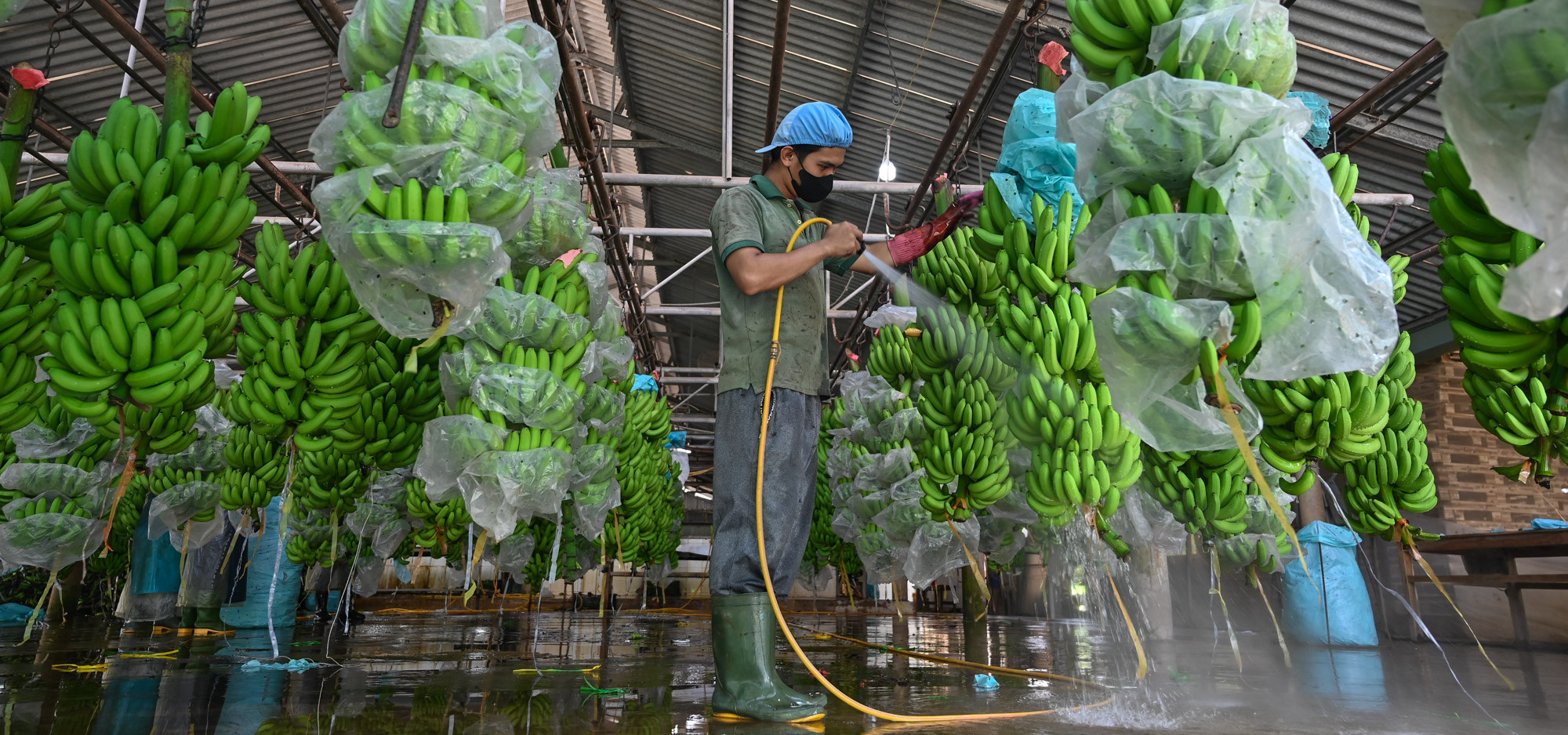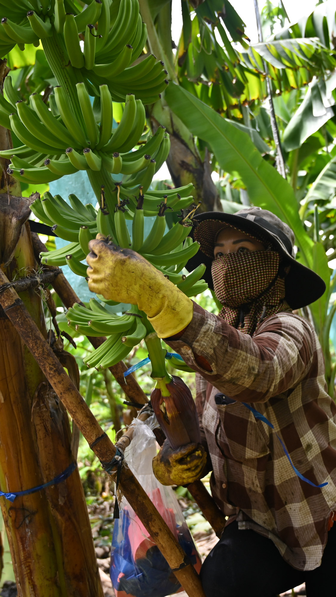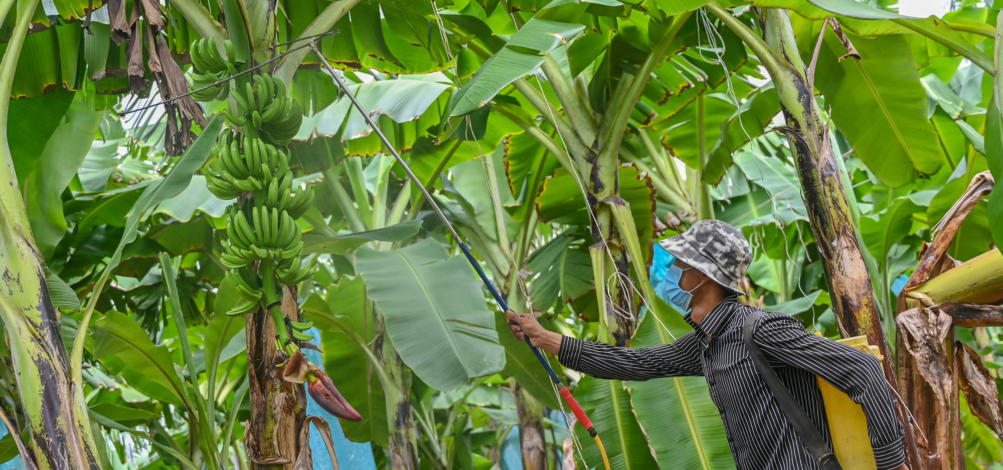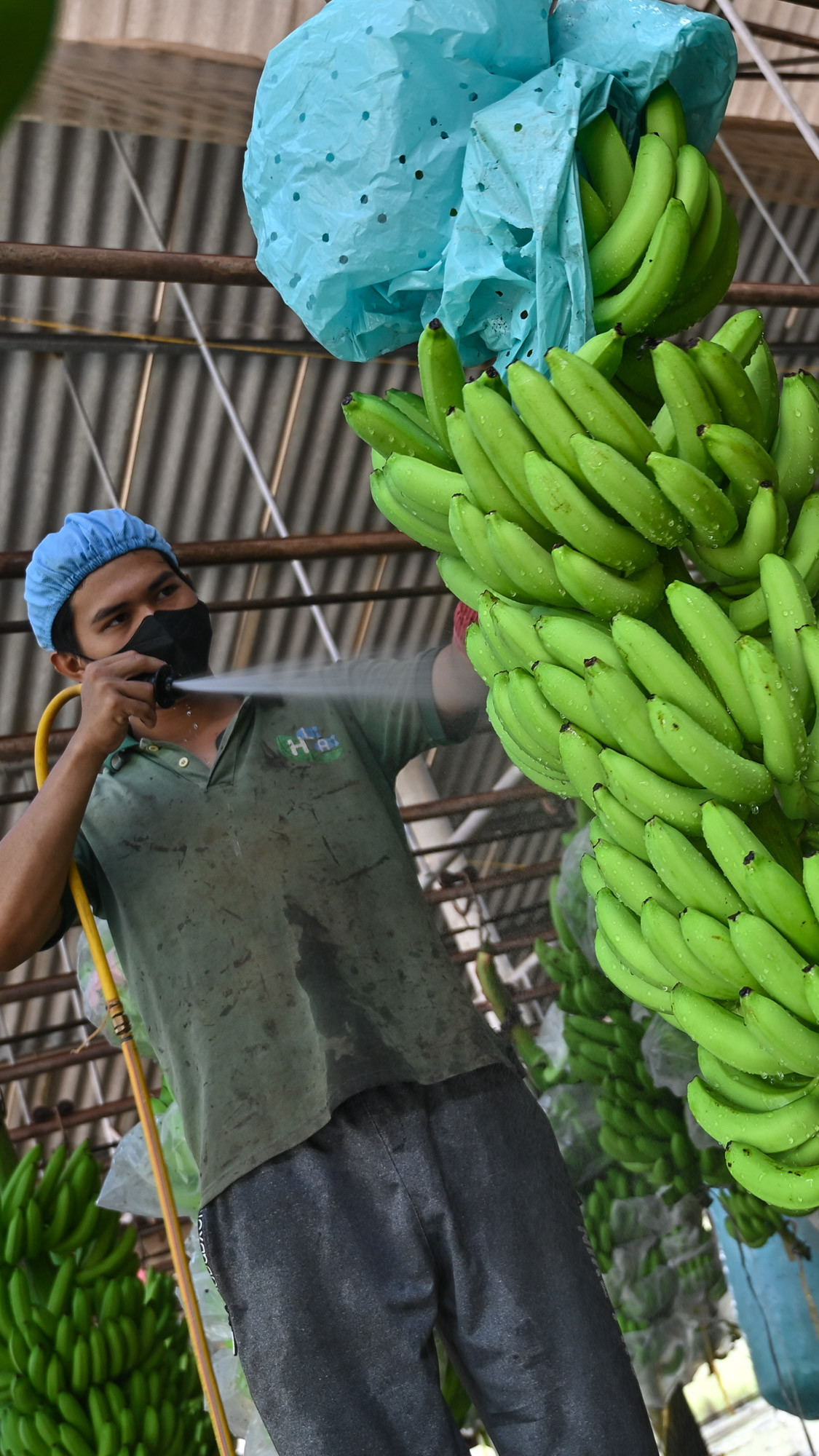 Có tất cả hơn 20 công đoạn để cho ra những trái chuối chất lượng đều đẹp, bắt đầu từ việc cày đất, vét mương, ươm trồng, tiêm bắp cho đến tỉa trái,... Khi buồng chuối được 3 tuần tuổi, công nhân tiến hành xịt thuốc trừ rệp.