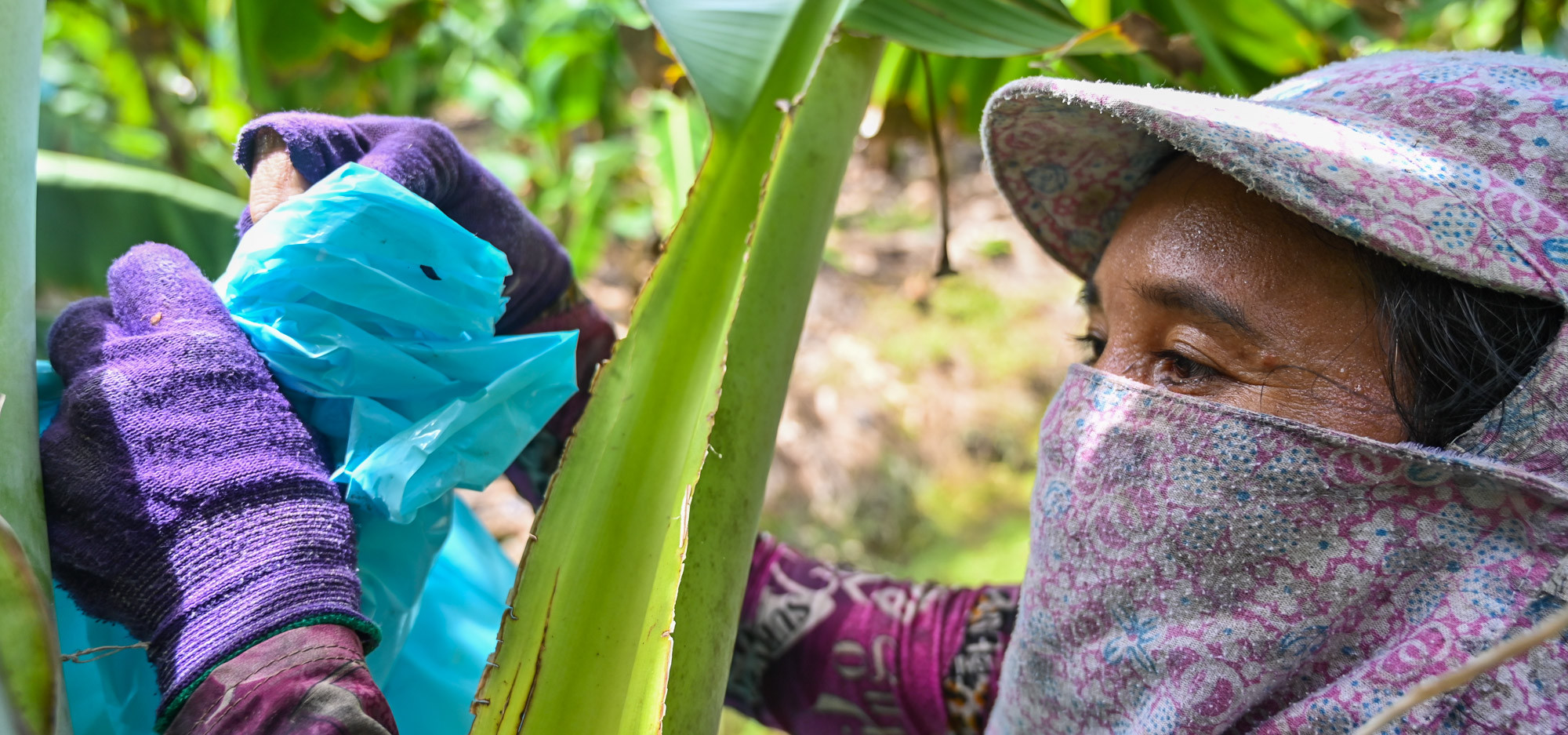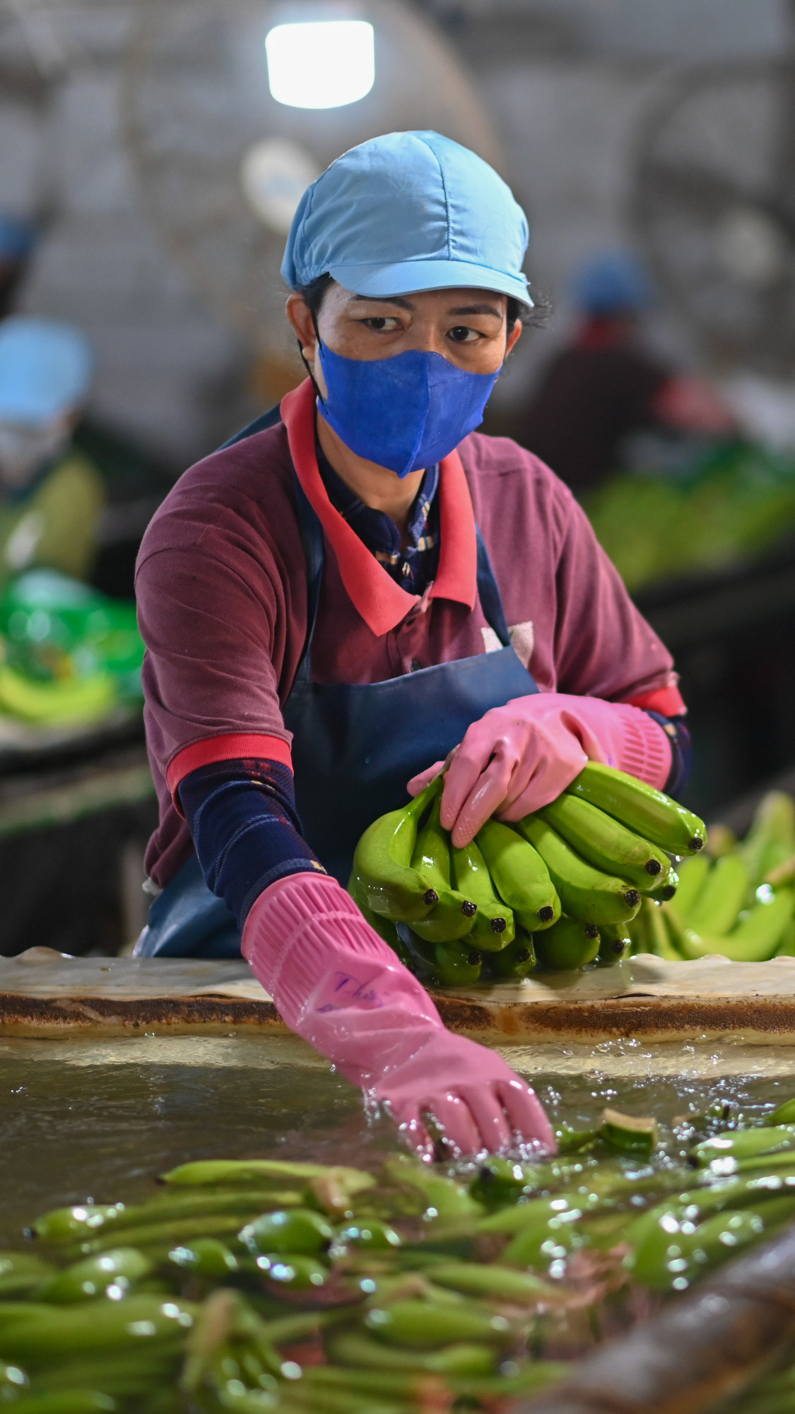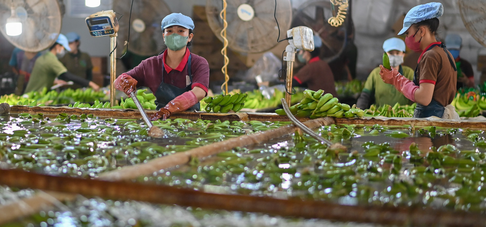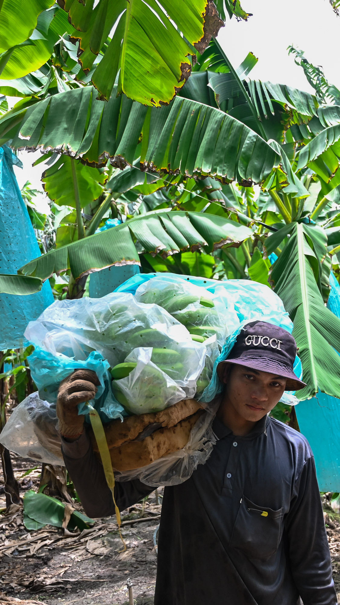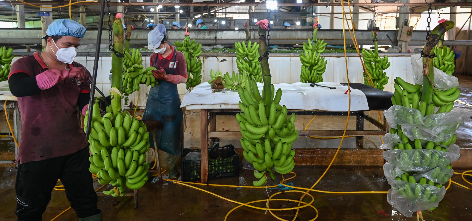 Có tất cả hơn 20 công đoạn để cho ra những trái chuối chất lượng đều đẹp, bắt đầu từ việc cày đất, vét mương, ươm trồng, tiêm bắp cho đến tỉa trái,... Khi buồng chuối được 3 tuần tuổi, công nhân tiến hành xịt thuốc trừ rệp.