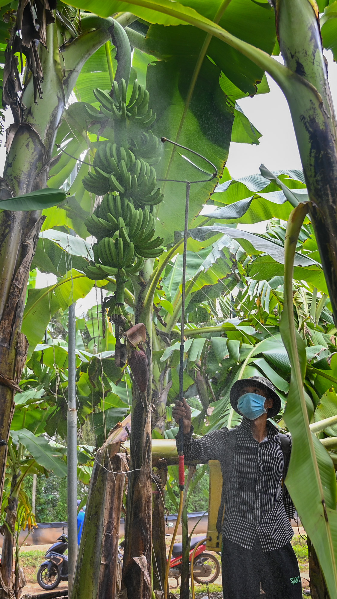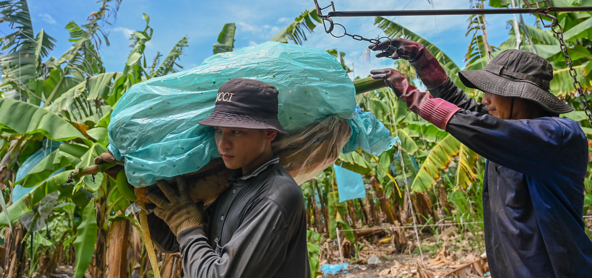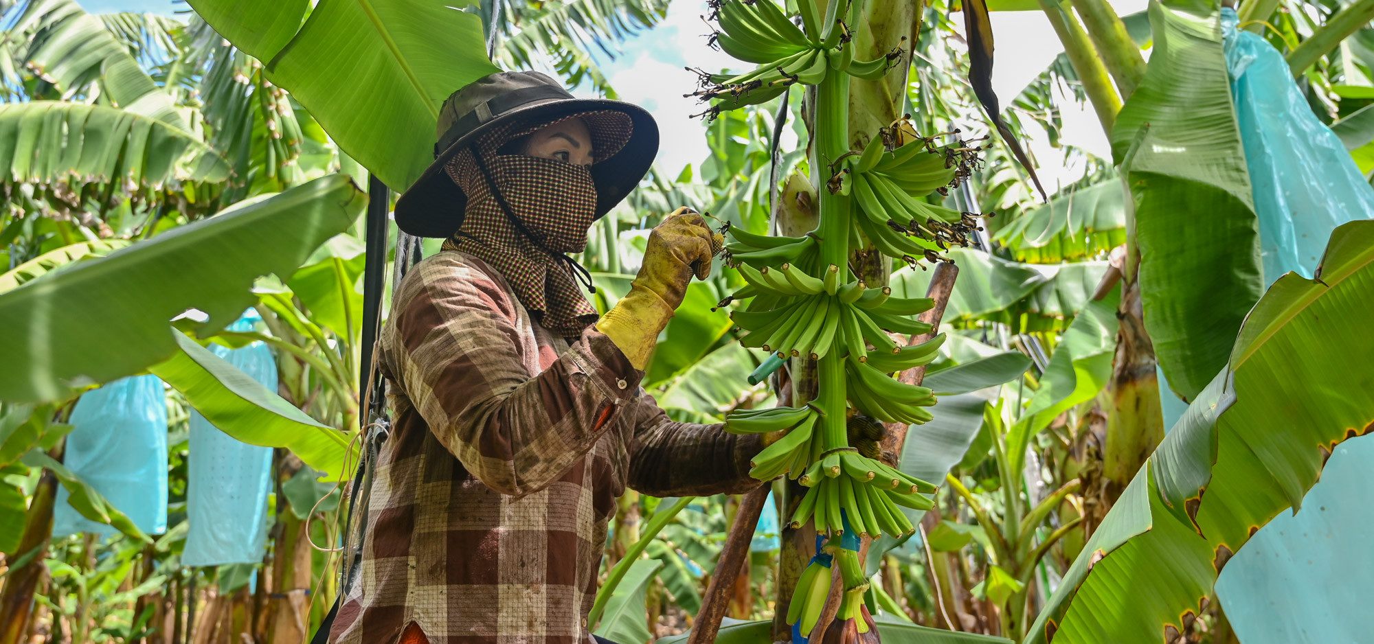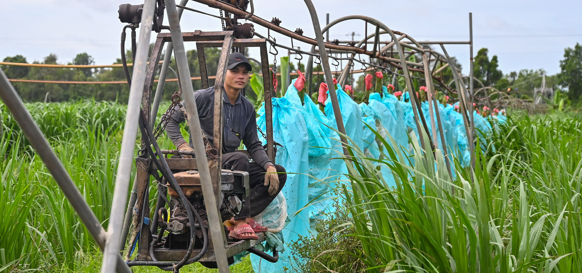 Có tất cả hơn 20 công đoạn để cho ra những trái chuối chất lượng đều đẹp, bắt đầu từ việc cày đất, vét mương, ươm trồng, tiêm bắp cho đến tỉa trái,... Khi buồng chuối được 3 tuần tuổi, công nhân tiến hành xịt thuốc trừ rệp.