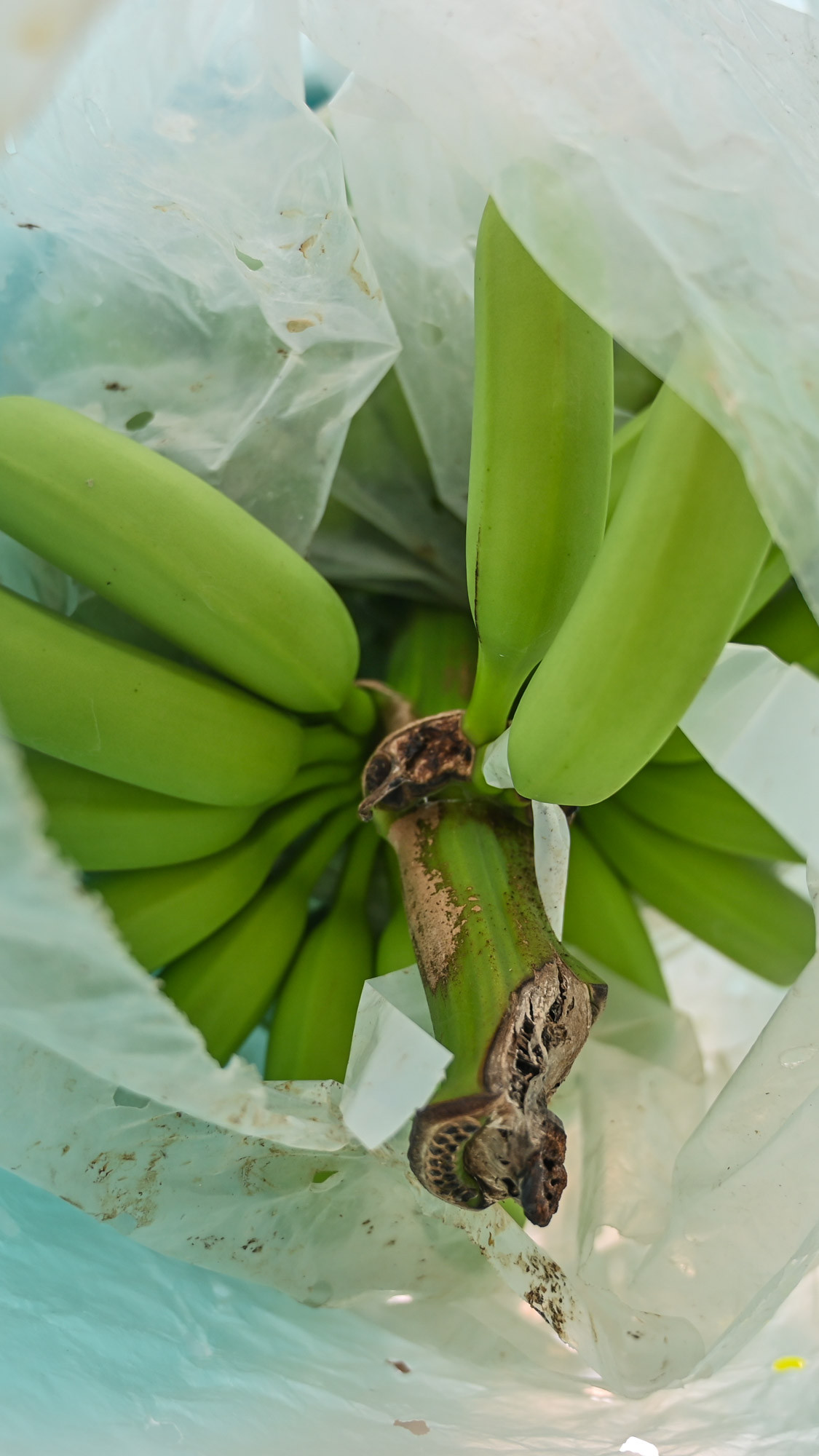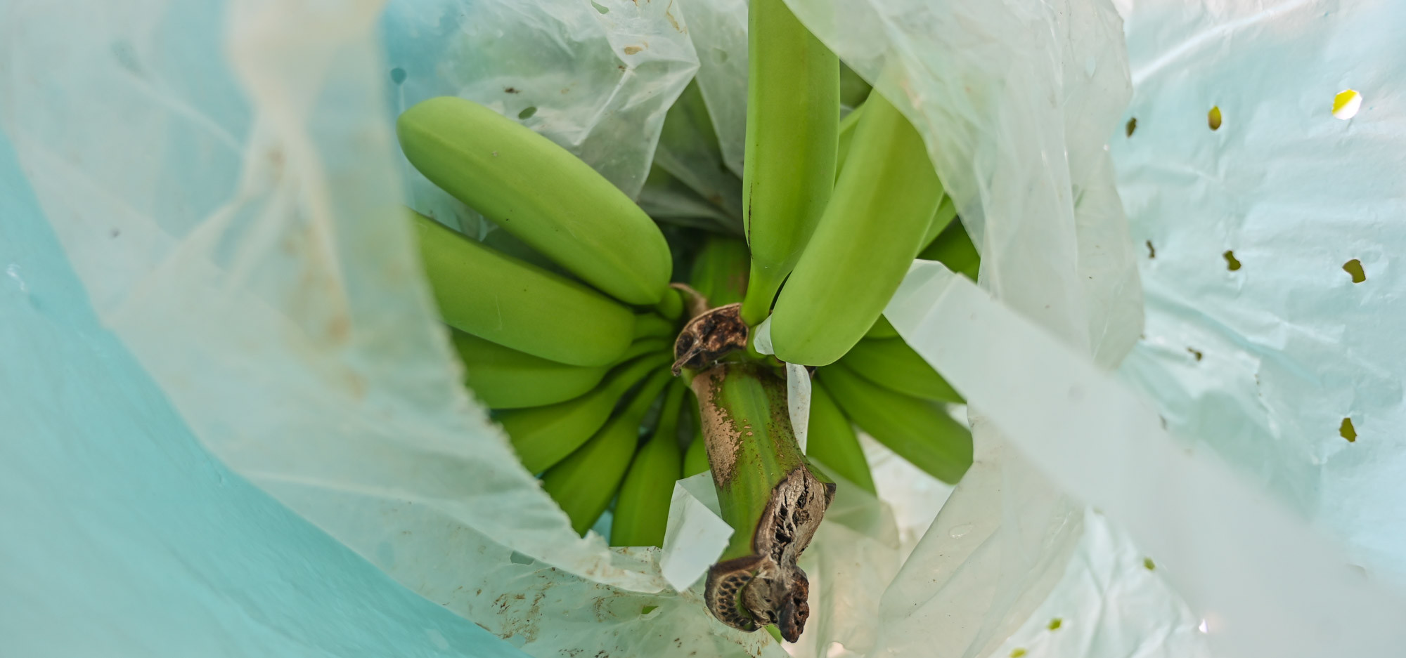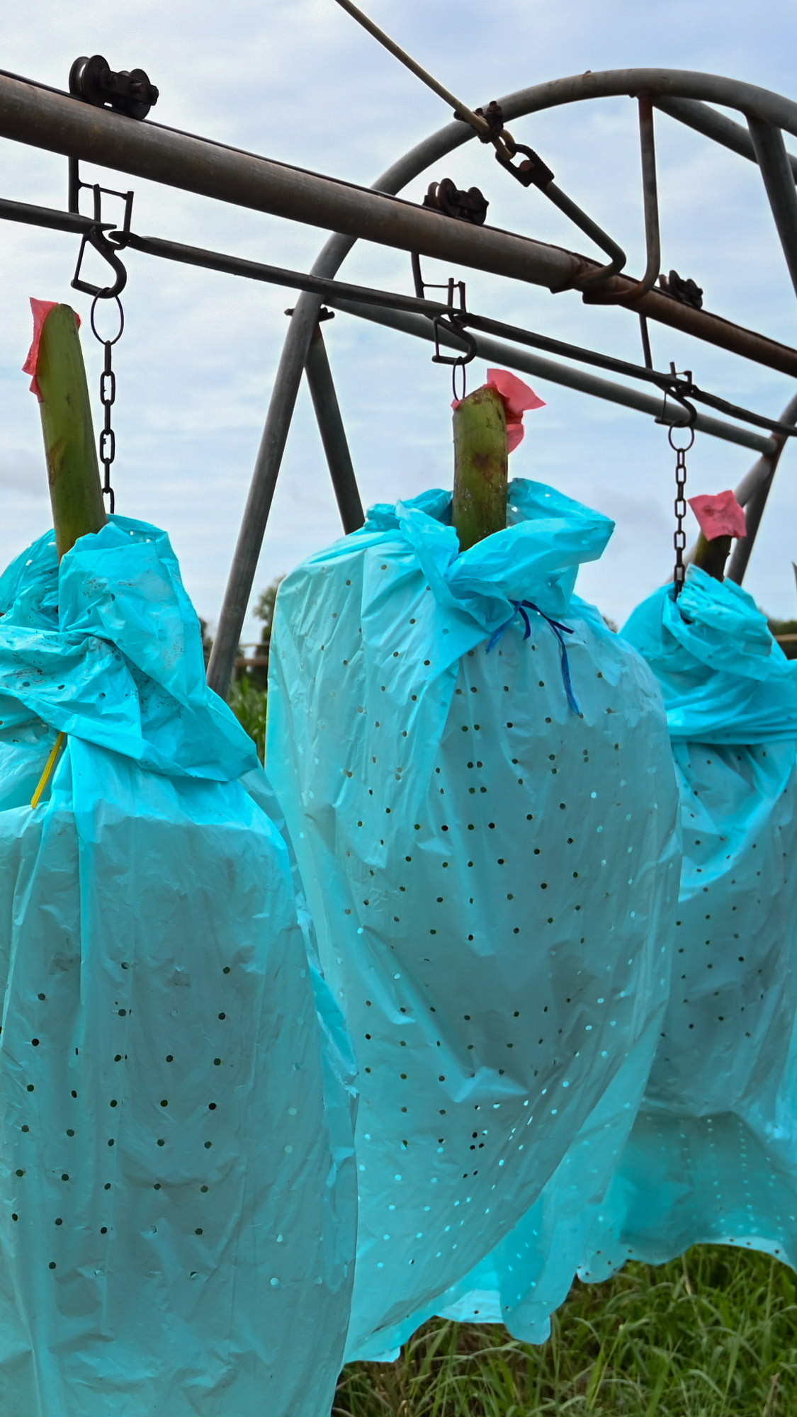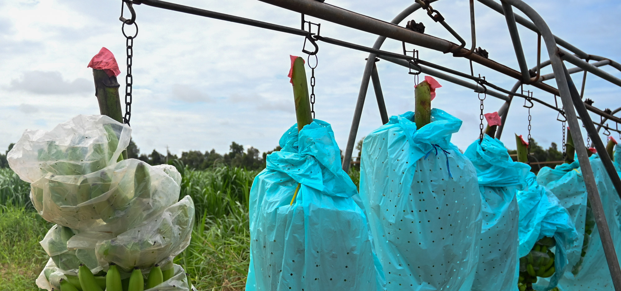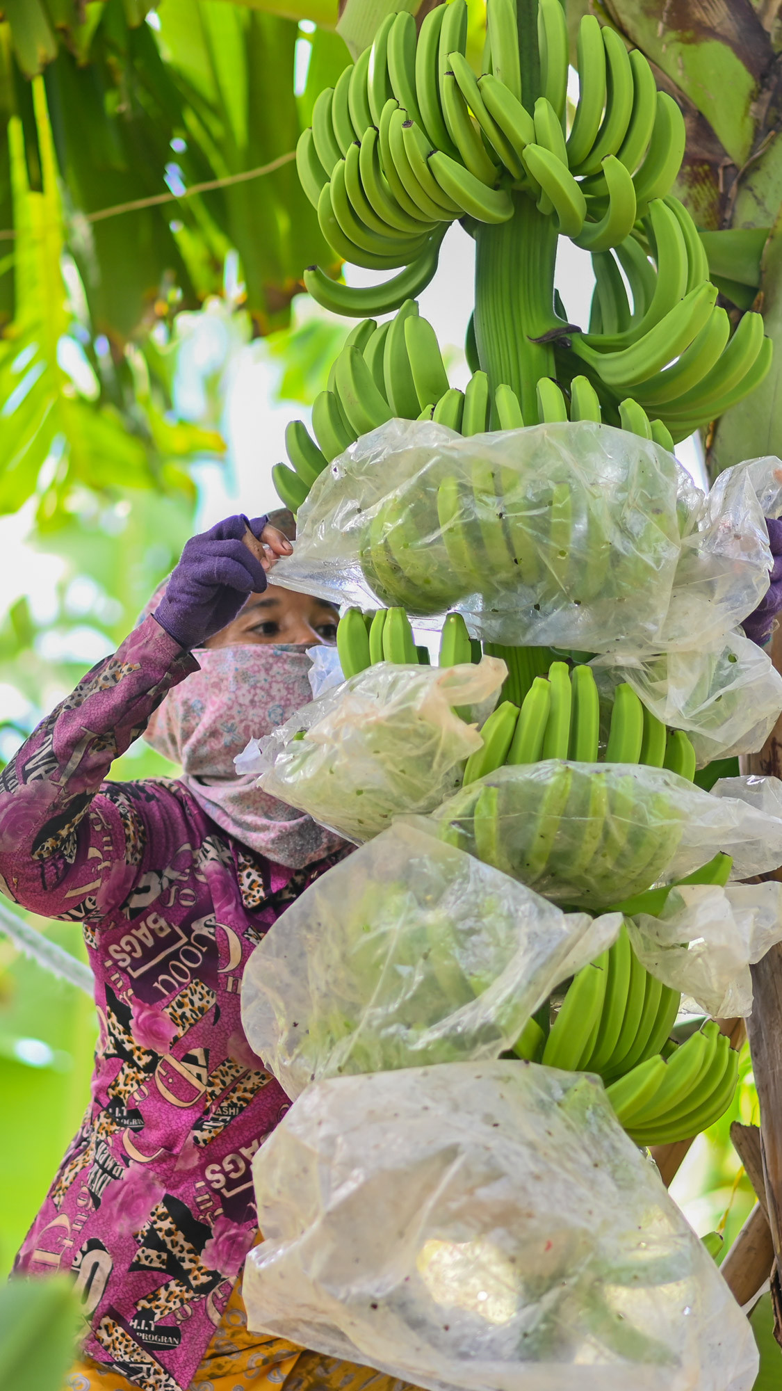 Buồng chuối sau đó được bao bọc bằng túi nylon để hạn chế sâu bệnh, đảm bảo trái ngon và thẩm mỹ.