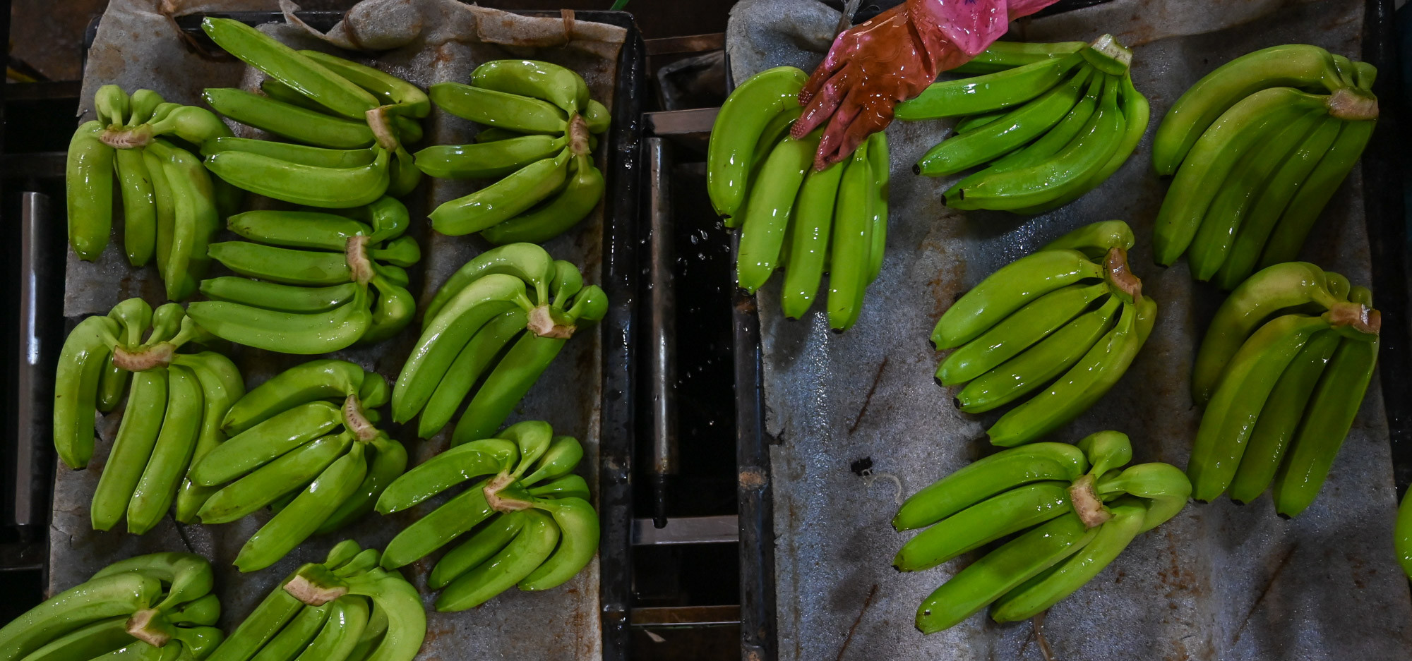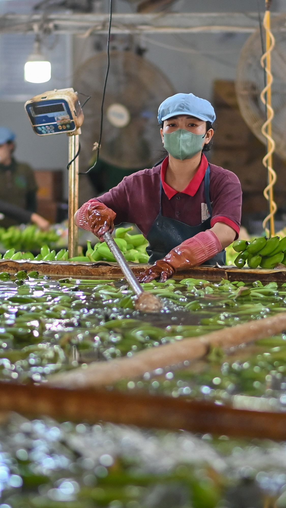 Chuối sau khi tách nải được thả vào hồ nước có chứa dung dịch sát khuẩn, làm sạch các vết mủ. Các tia nước từ hệ thống ống phun phía trên sẽ đẩy chuối di chuyển đến cuối hồ