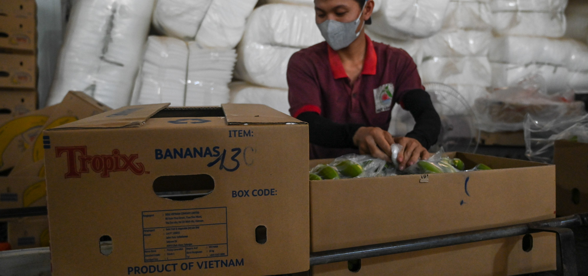 Do được trồng xen kẽ, chuối được thu hoạch mỗi ngày trong suốt cả năm. Trong ảnh, anh Tâm và các công nhân khác bận rộn từ 5h sáng để vận chuyển nhằm đảm bảo quy trình đóng gói hoàn tất đúng thời hạn.