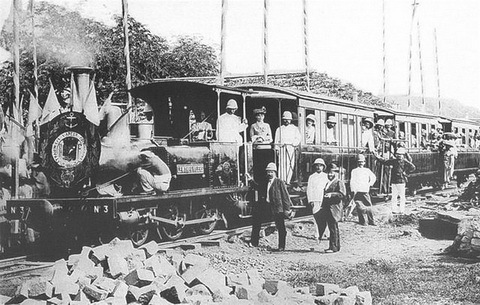 Khánh thành đường sắt Sài Gòn-Chợ Lớn ngày 27/12/1881. Bảng hiệu trước đầu máy xe lửa hơi nước mang tên Tramways Vapeur Cochinchine 1881. (Ảnh: Internet) |