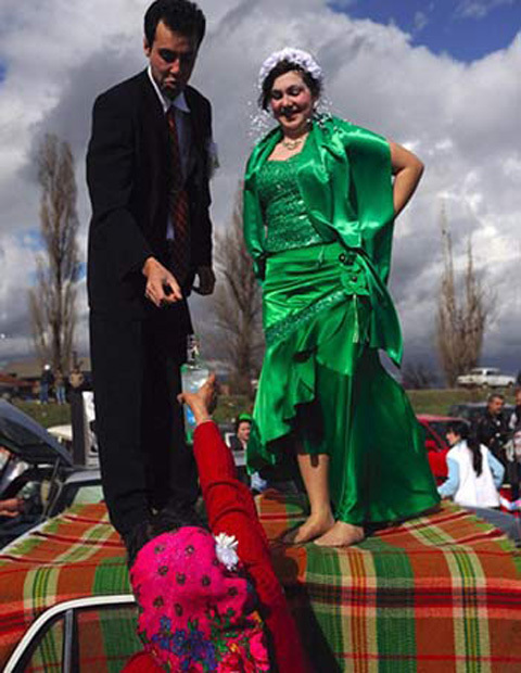 | Và phiên chợ cũng là một cơ hội cho các cặp vợ chồng mới kết hôn để kỷ niệm lễ cưới của mình bằng cách nhảy múa trên nóc xe ô tô và uống rượu mừng. |