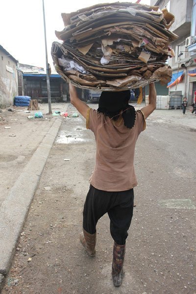 Bà Sinh, năm nay đã ngoài 70 tuổi, người gốc Thái Nguyên, bà có dáng người nhỏ bé, khăn quấn đầu, bà mặc một chiếc quần vải đen và chiếc áo cộc tay đã ngả màu. Tuy đã có tuổi, nhưng bà vẫn rất nhanh nhẹn, hoạt bát. Cứ sáng sớm, tầm 4h, khi mà thành phố vẫn còn đang say trong giấc ngủ, bà lại đi khắp chợ Long Biên để nhặt nhạnh túi nilon, bìa các tông, chai lọ…công việc đó cứ quay đều suốt mấy chục năm qua. “Bìa 5000/kg, còn túi nilon thì 6000/kg…cả ngày cứ bán cái nọ, cái kia cũng đủ sống” – Bà chia sẻ.