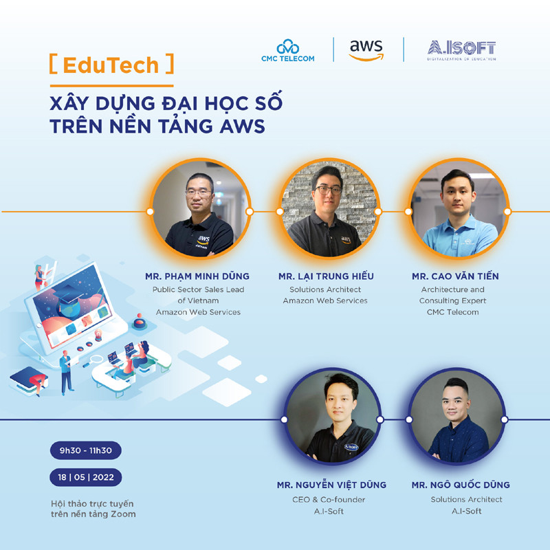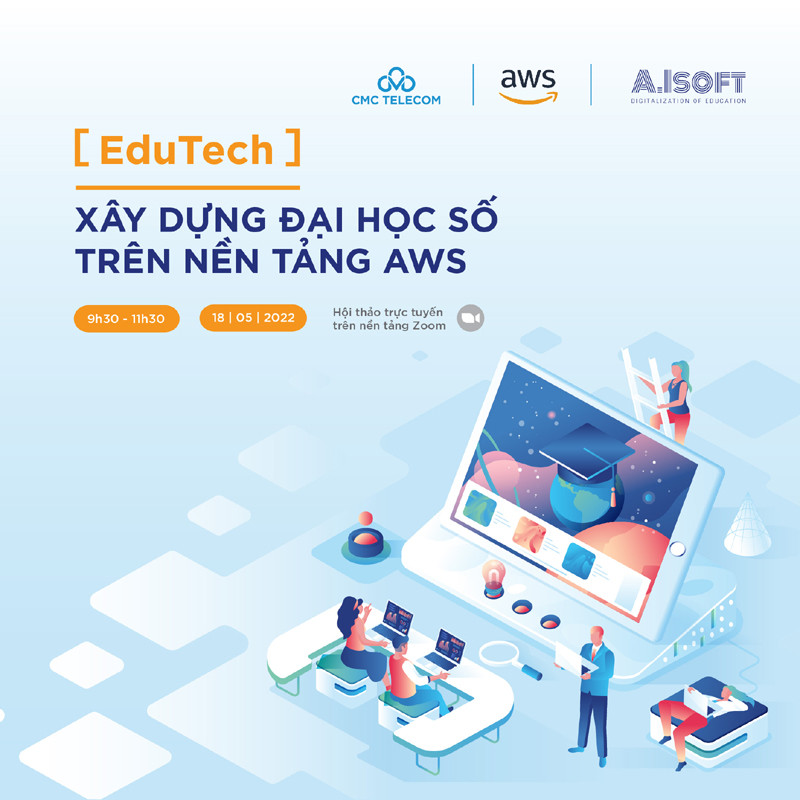 Theo CMC Telecom, hội thảo “EduTech: Xây dựng Đại học số trên nền tảng AWS" do CMC Telecom phối hợp cùng AWS và AISoft tổ chức ngày 18/5/2022 sẽ chia sẻ bức tranh toàn cảnh về xu hướng công nghệ giáo dục mới, cách thức ứng dụng các giải pháp công nghệ hiện đại nhất nhằm nâng cao hiệu quả, năng suất cho công tác quản lý, tuyển sinh, đào tạo mọi lúc mọi nơi, phục vụ đa dạng nhu cầu đào tạo của các trường đại học trên môi trường số. Link đăng ký tham gia: https://event.cmctelecom.vn/edutech