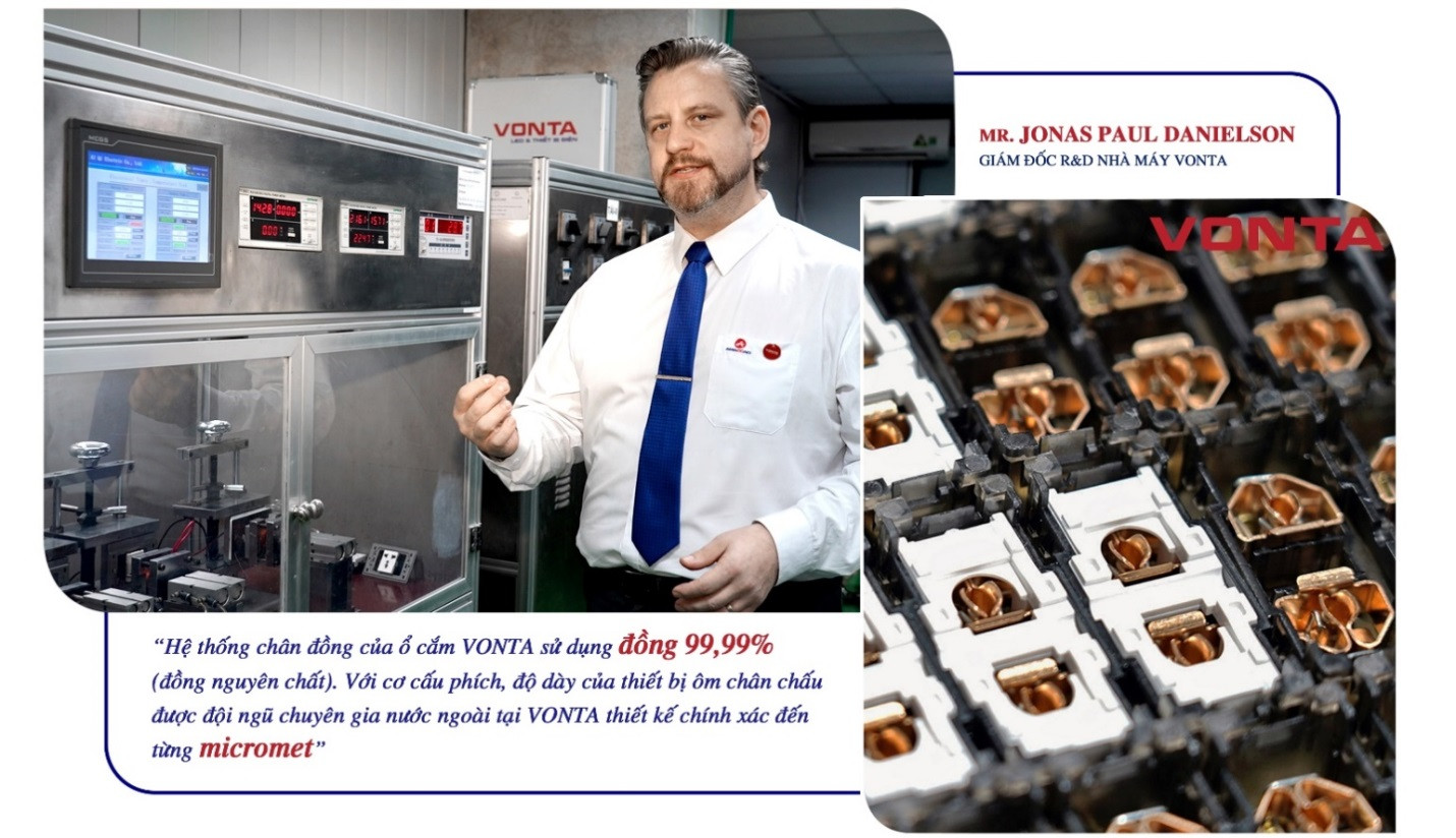 Chẳng hạn như với hệ thống chân đồng của ổ cắm (bộ ôm chân phích cắm), VONTA sử dụng đồng 99,99% (đồng nguyên chất). Với cơ cấu phích, độ dày của thiết bị ôm chân phích cắm được đội ngũ chuyên gia nước ngoài tại VONTA thiết kế chính xác đến từng micromet, có kết cấu hình cánh cung tiếp xúc đa điểm ôm trọn chân phích cắm, phù hợp cho cả phích tròn và phích dẹt. Nhờ vậy, các sản phẩm VONTA đảm bảo 30.000 lần cắm vẫn không chuyển dịch.