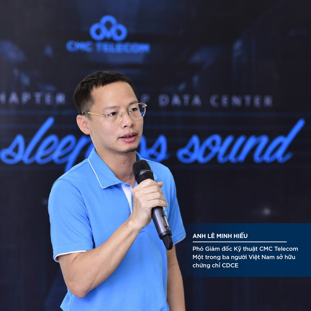 Ông Lê Minh Hiếu - Phó Giám đốc Kỹ Thuật CMC Telecom là 1 trong 3 người Việt Nam sở hữu chứng chỉ CDCE (Certified Data Center Expert), chứng chỉ cao cấp nhất về data center. Ông Lê Minh Hiếu chia sẻ: “Ngay từ khi hình thành dự án xây dựng data center, ban lãnh đạo Tập đoàn Công nghệ CMC và CMC Telecom đã xác định sẽ phải xây dựng một data center hiện đại, tiêu chuẩn không thua kém các data cennter của các nhà cung cấp dịch vụ hàng đầu thế giới. Sau khi dự án thành công sau gần 1 năm triển khai “thần tốc” và được Uptime đánh giá, chúng tôi tự hào nhận ra rằng, các kỹ sư công nghệ người Việt hoàn toàn có thể sánh ngang với các chuyên gia quốc tế”.