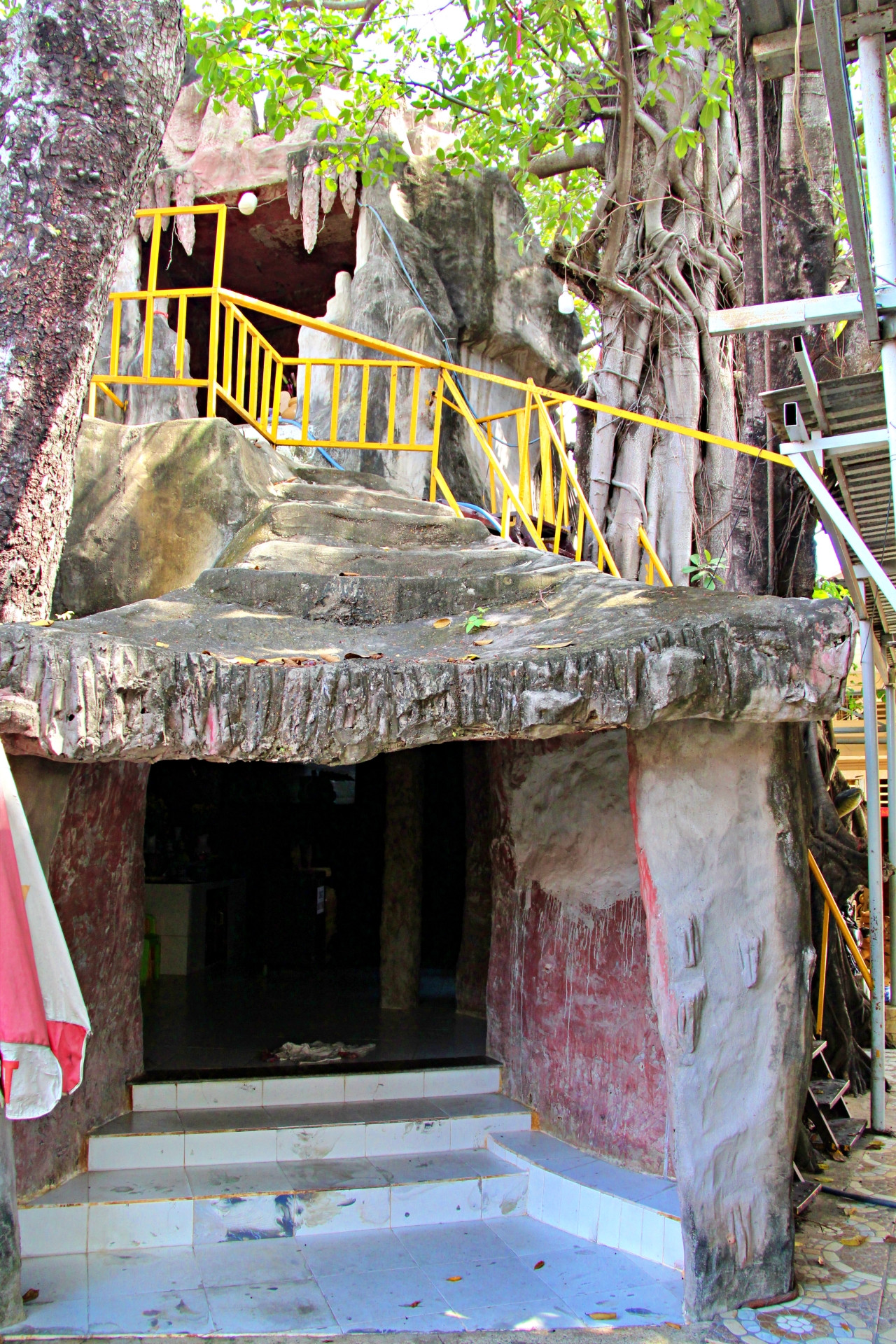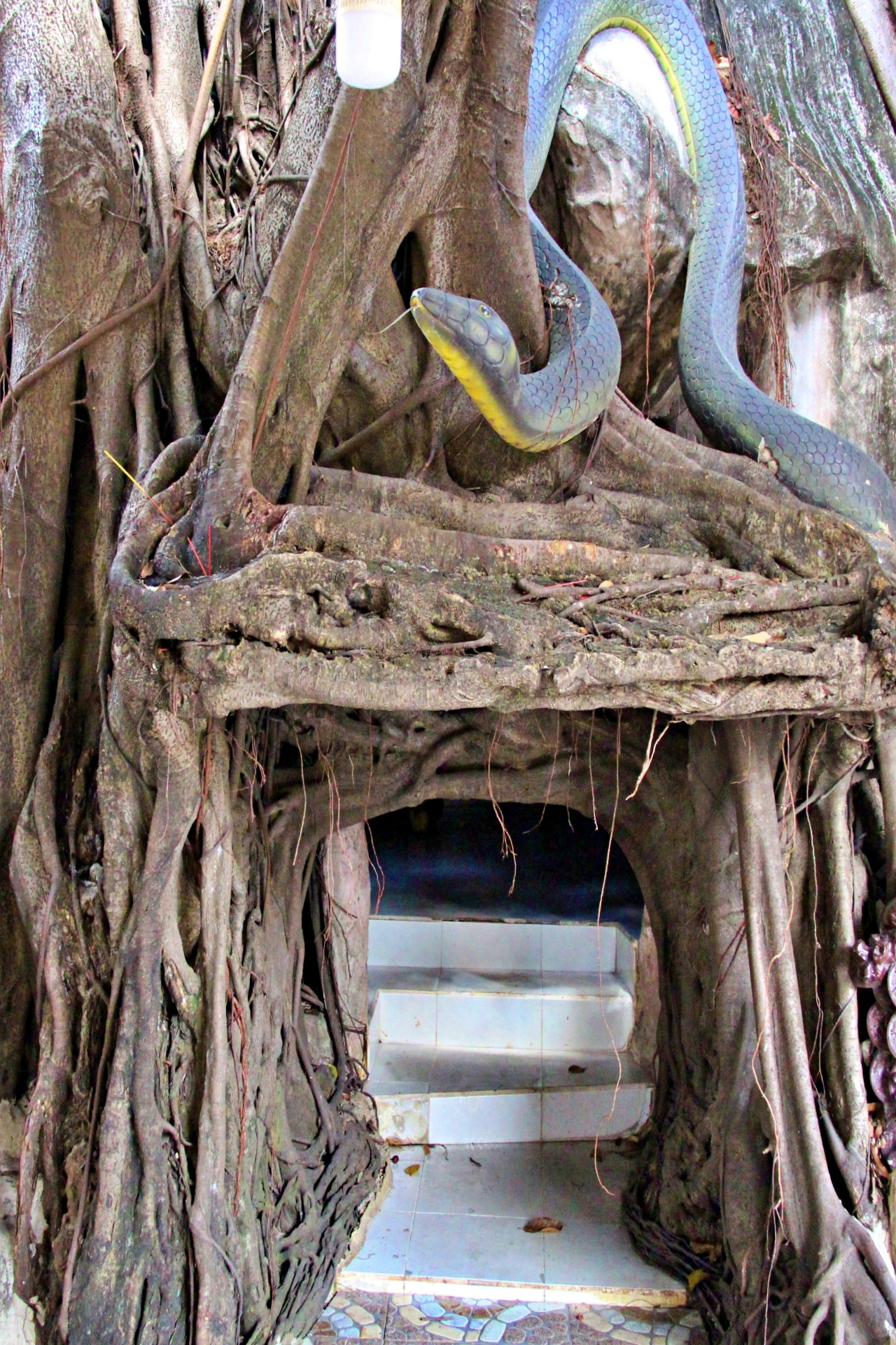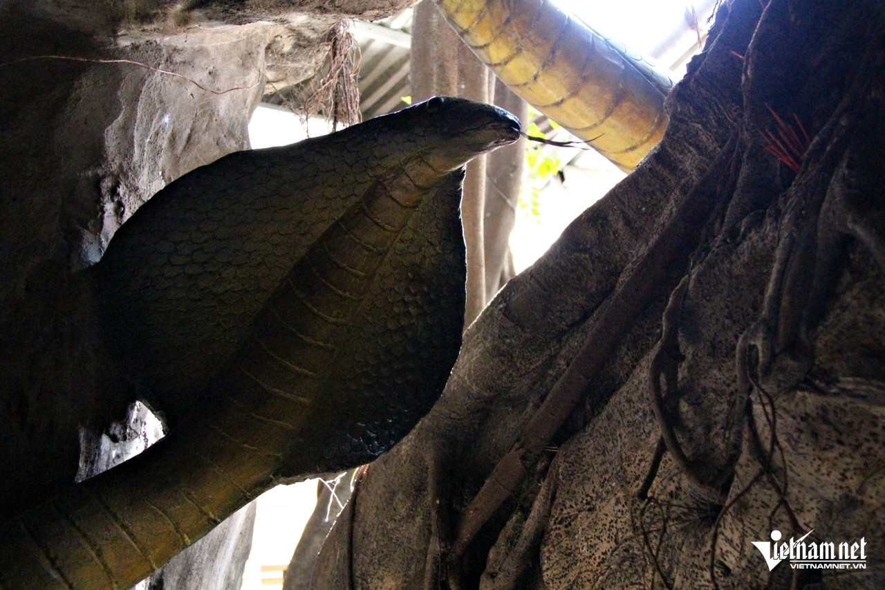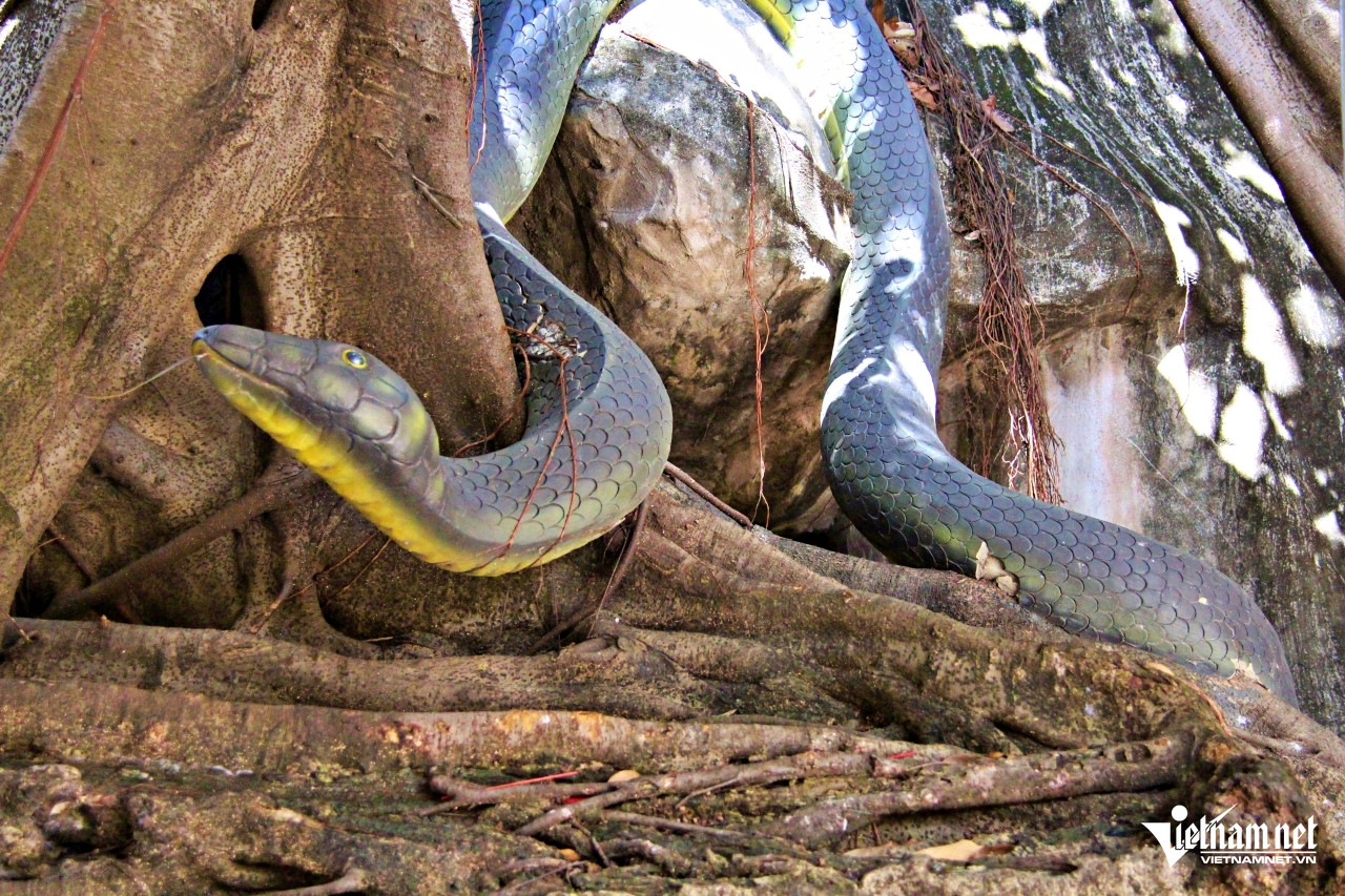 Bên trên cửa hang được tạo từ rễ cây có tượng rắn kích thước lớn, thân mình uốn lượn, trườn xuống mặt đất. Dưới cửa hang này có thêm tượng rắn khác đang phùng mang, đầu hướng ra phía ngoài.