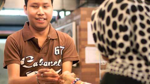 Anh Norjumanese làm việc như một thu ngân với những chữ nổi trên các phím và sử dụng một máy tính chữ nổi có khả năng đọc to các nút được người dùng gõ.