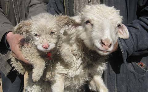 | Hai mẹ con cừu/chó tại một trang trại ở Thiểm Tây (Trung Quốc). Ảnh: Quirky China News. |